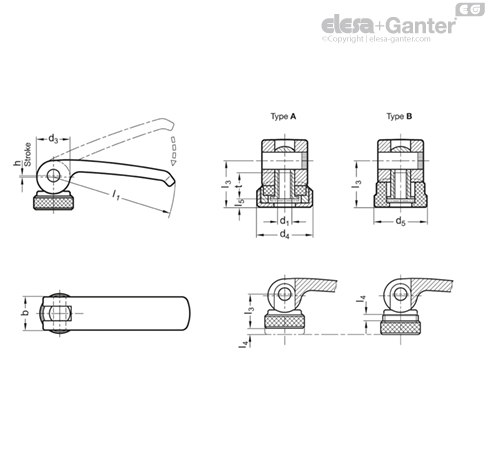 Ganter Standard Elements - Eccentric Clamps With Female Thread - 1 X Black Gn 927 63 M5 Width B A differenza del morsetto tramite una filettatura, consentono un serraggio senza coppia. Otto Ganter Gmbh&co.kg - Ganter Norm elementi – Eccentrico e con filettatura interna, 1 pezzi, nero, gn 927 – 82-B M8 b. I tenditori eccentrici GN 927, chiamati anche leva eccentrica o sgancio rapido, sono utilizzati per il serraggio e l'allentamento rapi La leva è progettata in modo che il movimento di serraggio della leva sulla massima la forza di serraggio non è possibile. Leva: zinco pressofuso; rivestimento in plastica, silicone poliuretanico inodore epossidico resina; nero, RAL 9005 Asse, treno dado: acciaio zincato, blu passivato Conforme a RoHS Forma B: disco di plastica cuscino disco senza dado; regolazione: Termoplastica (poliammide) rinforzato con fibra di vetro Manico lunghezza l1: 63 mm; D filettatura: M6; lunghezza filettatura in Hub L2: 50 mm; h: 0 di serraggio, 75 mm