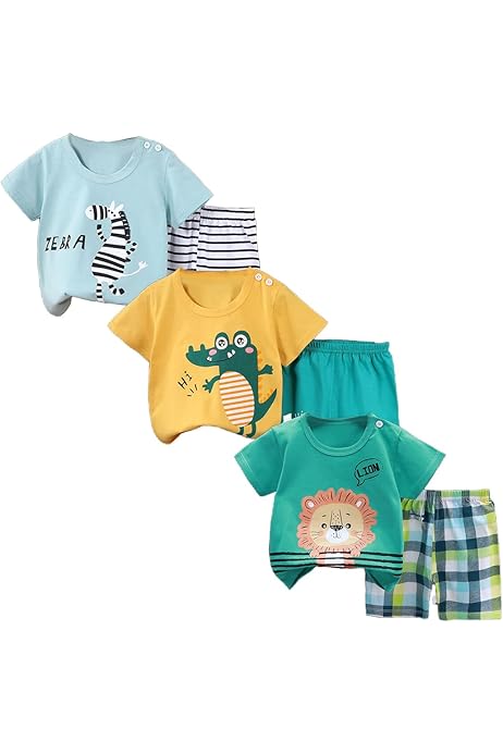 Generico Completo Estivo Neonato E Bimbo, T-Shirt, Canotta E Pantaloncini In Cotone, 3 Pezzi, Stampa Carina, Look Casual, Comodo E Traspirante, Regular Fit, 1644 (Giallo, 9 Mesi