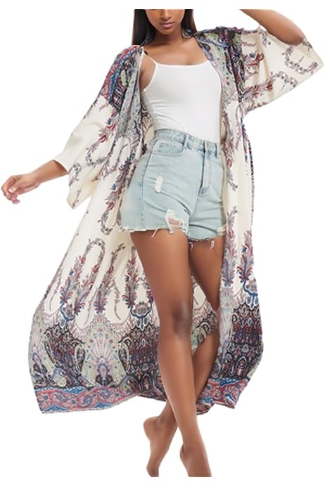 JAGETRADE Cardigan Estivo Da Donna In Chiffon A Mezza Manica Boho Retrò Geometrico Floreale Stampato Con Nappe Frange Patchwork Bikini Coprire Lunghezza Alla Caviglia Kimono Mantello : Amazon.it: Moda