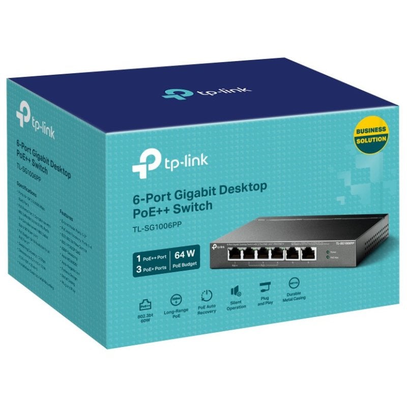 Colore del prodotto: grigio. Indicatori LED: sì. Certificazione FCC, CE, RoHS. PerformanceFanlessSì. 5 Port PoE Switch | 3 PoE+ and 1 PoE++ Ports @64W, w/ 2 Uplink Gigabit Ports | Sturdy Metal | Plug & Play | Extend Mode | PoE Auto Recovery | QoS & IGMP Design: montaggio a rackSì. E-T, 100BASE-TX, 1000BASE-TTypes di cavi supportaCat3, Cat4, Cat5, Cat5e, Cat6Flow Support YesAuto MDI/MDI-XYesEthernet LAN velocità dati 10,100,1000 Mbit/s. Negoziazione automatica Sì. 3 anni di garanzia contro i difetti di fabbrica. Prodotto di marca originale. Può rilevare e alimentare automaticamente tutti i dispositivi alimentati (PD) conformi IEEE802.3af/at/bt alla porta 1 e ai dispositivi alimentati (PD) conformi a IEEE 802.3af/at alla porta 2-4. In questa situazione, l'alimentazione elettrica viene trasmessa con i dati in un unico cavo che consente di espandere la rete dove non ci sono linee elettriche o prese, dove si desidera riparare dispositivi come AP, telecamere IP o telefoni IP, ecc. (10/100/1000) Standard di rete IEEE 802.1p, IEEE 802.3af, IEEE 802.3at, IEEE 802.3bt, IEEE 802.3i, IEEE 802.3u, IEEE 802.3x10G supporta il cablaggio Ethernet NoCopper technology10BASS. Caratteristiche di gestione Tipo di interruttore: Supporto per la qualità del servizio (QoS) Sì. Switch Alimentado Por TP-Link TL-SG1006PP Gigabitový PoE Switch | Axilogi S.r.o Tplink Switch