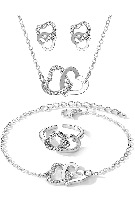 Facile da Combinare: La nostra collana donna, orecchini, bracciale e anello possono essere facilmente combinati con l'abbigliamento quotidiano, abiti da sera e abiti da sposa. Eventi Versatili: Questo set di gioielli è ideale per feste, matrimoni, feste di laurea e uso quotidiano. Acquista FDEETY 4PCS Parure Gioielli per Donna Ragazze Collana Orecchini Cuore Bracciali e Anelli Set Zirconi Cubici Gioielli Set Sposa Regalo per San Valentino Natale spedizione gratuita resi gratuiti su prodotti idonei Ideale per pelli sensibili e uso quotidiano. Materiali di Alta Qualità: Il nostro set di gioielli è composto da diamanti artificiali di alta qualità e una lega robusta. Mostra il tuo affetto con un regalo che ispira e crea momenti indimenticabili. Un regalo pensato che trasmette gioia e consapevolezza di stile e si adatta ad ogni occasione speciale. Design Elegante: Vivi l'eleganza senza tempo dei nostri gioielli da donna con diamanti artificiali. Perfetto per le donne che apprezzano lo stile classico e la raffinatezza. Le due cornici a forma di cuore, circondate da pietre scintillanti, conferiscono ad ogni pezzo un tocco vintage-elegante. Set Collana E Orecchini Donna FDEETY 4PCS Parure Gioielli Per Donna Ragazze Collana Parure Gioielli Donna