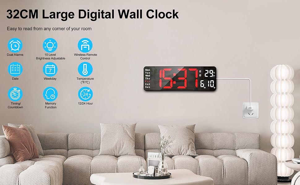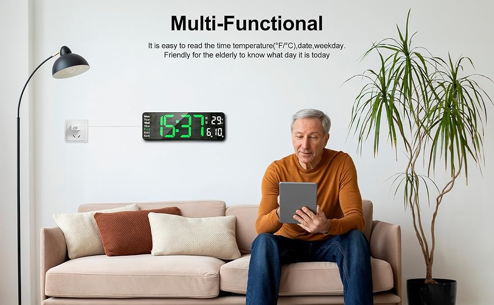Non è necessario reimpostare l'orologio al ripristino dell'alimentazione. 【Telecomando Intelligente】Oltre ai pulsanti sul retro, l'orologio parete digitale è dotato di un telecomando che consente di impostare facilmente l'ora dell'orologio o di fermare la sveglia. Lafocuse Orologio da Parete con Datario e Termometro LCD Silenzioso Orologio ... ; Color: Argento ; Size: Diametro: 30 cm ; EAN: 0717351612119 ; ISBN: 0717351612119 È dotato di una batteria a bottone che supporta la funzione di memoria, che memorizza l'ora e le impostazioni della sveglia in caso di interruzione imprevista dell'alimentazione. 【Cavo Alimentazione & Funzione Memoria】Per funzionare, questo orologio digitale deve essere collegato a una cavo di alimentazione. Se non si desidera il tempo di snooze, basta premere uno qualsiasi degli altri pulsanti per fermare la sveglia. È possibile regolare manualmente la luminosità o attivare la funzione fotosensibile per regolarla automaticamente, in modo da non disturbare la luce dell'orologio durante il sonno. Grande Idea Regalo Grazie ai 3 ganci resistenti e alla robusta maniglia di supporto, può essere utilizzato sia come orologio da parete che da tavolo. 【Orologio da Tavolo & Orologio da Parete】Dotato di 3 ganci resistenti e di una robusta maniglia di supporto, è possibile scegliere liberamente di appendere questo orologio digitale con ampio display alla parete o di posizionarlo sulla scrivania, per una maggiore comodità nella vita quotidiana. È inoltre un regalo gradito per compleanni, lauree, inaugurazioni di case e festeggiamenti di Capodanno per chi ha il sonno pesante, per i bambini e per gli anziani. Sveglia Da Comodino Derkiewn Sveglia Digitale, Grande Schermo A Specchio LED Da 7'', 2 Luminosità, 12/24 Ore, Temperatura, Data, Snooze, Alimentazione USB, Funzione Di Memoria (verde Orologio Digitale Da Parete Perel