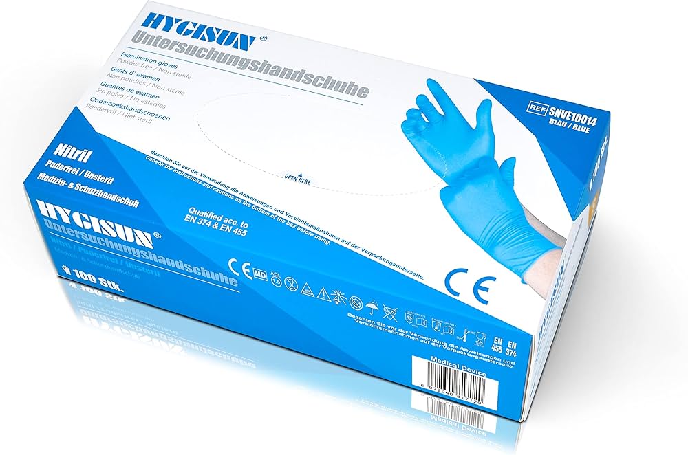 I guanti monouso sono realizzati in nitrile delicato sulla pelle e resistente. I guanti monouso in nitrile Hygisun hanno una forma universale e sono quindi adatti a entrambe le mani. Il materiale morbido e adattabile garantisce un comfort ottimale. Guanti in nitrile blu senza polvere, monouso, per protezione da agenti chimici e microrganismi. Ogni confezione contiene 50 paia di guanti ambidestri. Disponibili in diverse taglie (consulta la guida Protezione affidabile: i guanti monouso Hygisun nitrile offrono una protezione affidabile, grazie ai più elevati standard (EN 455 & EN 374), quindi non sono solo perfetti per la gastronomia, la medicina e molto altro ancora. I guanti in nitrile senza polvere Hygisun sono un prodotto medico e industriale con l'intento di prevenire la trasmissione di agenti patogeni, batteri e funghi e proteggere chi lo indossa da liquidi, di qualsiasi tipo. Guanti Nitrile S Guanti Monouso Nitrile S MC Trading 100 Pezzi - Farmacia Loreto Guanti In Nitrile Senza Lattice Sensibilità al tatto: i guanti in nitrile hanno un'elevata sensibilità al tocco e sono quindi comodi da indossare. ma anche per la vostra casa! Inoltre, i guanti usa e getta sono indossabili da entrambe le mani e offrono una protezione estesa per chi lo indossa grazie al polsino di perle sul polso. ✓ Alimentari – I guanti in nitrile Hygisun sono di qualità alimentare e quindi una soluzione buona e affidabile nell'industria alimentare, nella gastronomia o nella vostra cucina. Sono resistenti, resistenti agli strappi e sono impermeabili all'aria