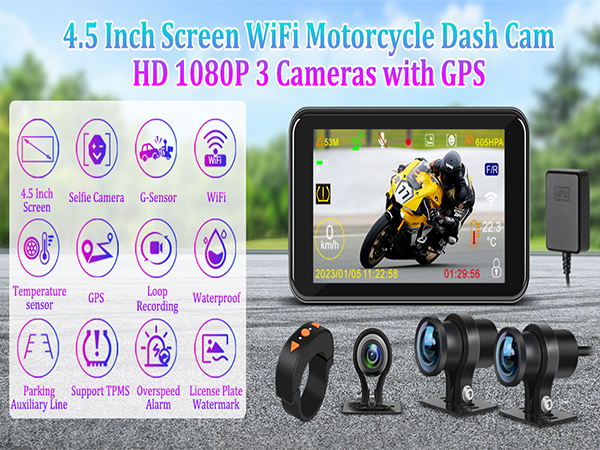 VSYSTO 4.5 Pollici Schermo WiFi Moto Dash Cam, Impermeabile HD 1080P Selfie E Fotocamera Anteriore E Posteriore 150 ° Grandangolo, Sensori Di Pressione Pneumatici, GPS