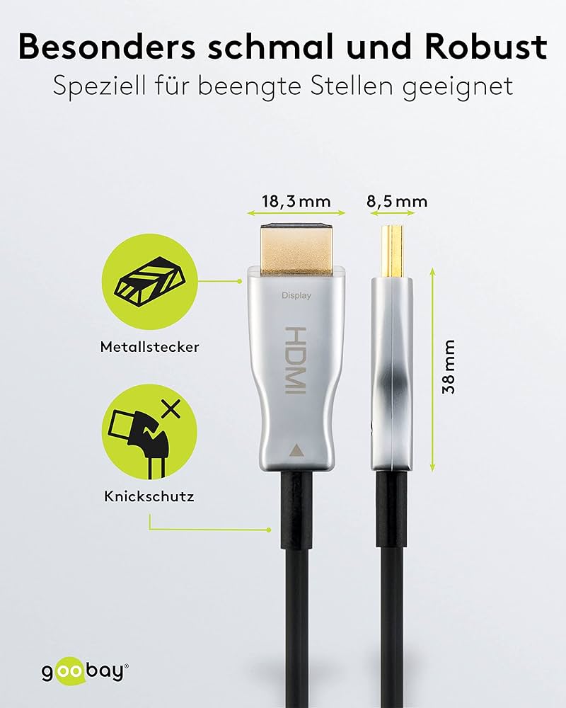 Cavo Hdmi Fibra Ottica Goobay Serie 2.1 Cavo HDMI™ Ottico Ibrido Ulra Ad Alta Velocità Hdmi 5 Metri Grazie alla tecnologia AOC, il cavo salva lunghi tratti di cavo senza perdite e raggiunge elevate velocità di trasmissione dati senza amplificazione l cavo HDMI ad altissima velocità collega televisori e monitor con console di gioco come PlayStation 5 o Xbox Series X, nonché proiettori e ricevitori di streaming come Amazon Fire TV o Apple TV Cavo HDMI 2.1 ad altissima velocità con Ethernet. Questo cavo ottico HDMI progettato da Goobay è ideale per coprire lunghe distanze e offre una flessibilità di gran lunga superiore e una velocità di trasmissione più elevata rispetto a un tradizionale cavo I tappi in metallo stretti e robusti con protezione antipiega sono particolarmente adatti per spazi ristretti