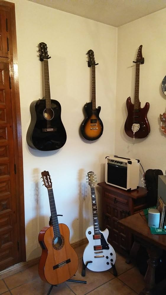 Nota: questo potrebbe non essere adatto per un banjo piuttosto tipico dal collo stretto e dalla testa stretta. Mostra la tua collezione: perfetto per esporre le tue chitarre e tenerle lontane dal pavimento e lontano dai pericoli. Fits all size bass and electric guitars. Flexible support arms hug the neck of any guitar for a secure fit. 2 Guitar Hangers, with nitro finish friendly material. Width adjustable arms to fit most guitars Stand Appendiabiti 1 Pc Guitar Hanger Hook Holder Wall Mount Stand Rack Bracket Corde Chitarra Elettrica Facile installazione con viti e supporto in plastica per muro a secco. Larghezza del braccio regolabile, girevole ed espandibile per abbracciare saldamente qualsiasi paletta o manico della chitarra per evitare cadute o urti indesiderati. Specifiche tecniche: Dimensioni supporto per chitarra: Dimensioni dei plettri: Informazioni sulla confezione: 4 ganci per chitarra. Il rivestimento in gomma morbida e il materiale in spugna assicurano che non rimangano segni, graffi o impronte sui tuoi preziosi strumenti a corda. Perché scegliere questo? Uso versatile: adatto per una varietà di strumenti a corda come chitarre, bassi, violini, mandolini, ukulele, ecc.