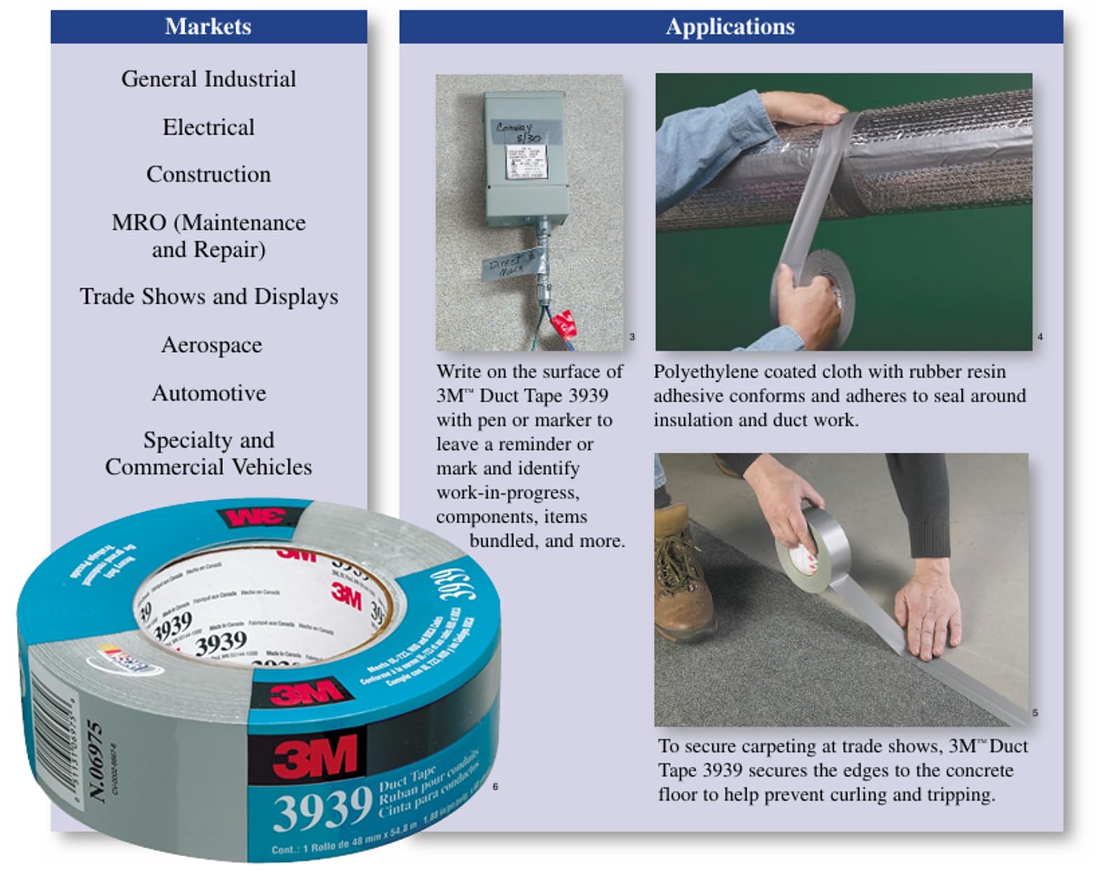 Elevata resistenza alla trazione. Conformabilità. 3m 3939 Data Sheet 3M™ 3939 Heavy Duty Duct Tape, 48 Mm X 54.8 M (1.88 In X 60 Yds) - Gray 3m 3939 Tape Nastro in tessuto universale a forte tenuta 3M 389 Tenuta e conformabilità eccellenti e possibilità di strapparlo con le mani. Resistenza a umidità e vapore acqueo. Il nastro per condotti 3M 3939 è composto da una pellicola di polietilene impermeabile su un supporto in tessuto provvisto di un adesivo in gomma ad alta aderenza che ne consente l'uso nelle applicazioni di nastro per condotti più esigenti Elevata resistenza alla trazione per tenuta solida sotto sollecitazione Resistenza ai raggi UV e all'acqua. Nastri telati e nastri americani 3M Questa linea di nastri telati e nastri americani aderisce alla maggior parte delle superfici in vari impieghi, dalla fasciatura alla protezione dall'umidità, dalla sigillatura alla giunzione, dal rinforzo al fissaggio di teli in poliestere. La notevoleficie in polietilene è in grado di resistere a usura, abrasione e all'acqua Rimozione senza residui, dalla maggior parte delle superfici opache. 3M Nastro conformabile multiuso 2903 Il nastro telato universale Scotch 2903 è una tela versatile in pellicola di polietilene su tessuto con una finitura in gomma sintetica. Nastro telato (americano) 3M 1900 Il nastro americano 3M 1900 è un pratico nastro per la cassetta degli attrezzi adatto ad impieghi generici tra cui sigillature leggere, lavori di fasciatura, marcatura e riparazioni temporanee in applicazioni non critiche. Può essere strappato a mano e in entrambe le direzioni Disponibile in diversi colori. Forte adesione istantanea. Nastro telato ad alte prestazioni 3M 8979 Per applicazioni in ambienti interni ed esterni, sia permanenti che temporanee. Ottima scelta per fissare in sospensione teli in polietilene per attività di contenimento Questo prodotto è progettato, fabbricato, etichettato e confezionato per la vendita a clienti industriali e professionali per l'uso sul posto di lavoro; non è destinato alla vendita o all'uso da parte dei consumatori