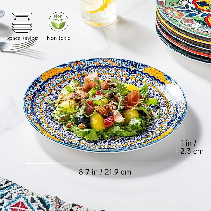 Con le alte temperature per la colorazione e la smaltatura, la ceramica non sbiadisce. Promettiamo che faremo ogni sforzo per risolvere il problema. Lo smalto liscio sui piatti li rende facili da pulire, sia a mano che in lavastoviglie. senza piombo e senza cadmio, resistente ai trucioli e non assorbe sapori o aromi degli alimenti. Ballonbogen tisch Ballonbogen tisch Il design bohémien di questi piatti da dessert non solo aggiunge colore e stile al cibo, alla tavola e alla cucina, ma porta anche appetito ed entusiasmo alla famiglia e agli ospiti. Appendili al muro o esponili sugli scaffali per aggiungere un tocco artistico e bohémien alla tua casa, creando un'atmosfera accattivante e stimolante. Piatti Pizza Henten Home Piatto Piano, 6 Pezzi Grandi Piatti In Ceramica - 28cm, Piatti Di Molti Colori, Stile Bohémien, Servizio Da Tavola In Gres : Amazon.it: Casa E Cucina Piatti Piani 😃COLORI VIBRANTI E MOTIVI SPECIALI - Progettato da un'arte dipinta a mano con colori brillanti e motivi intricati, questo set di stoviglie rende ogni pasto un'occasione di festa. 😃SERVIZIO CLIENTI SODDISFATTO – Se riscontri problemi con i nostri piatti dopo averli ricevuti, contattaci! Oltre a servire il cibo, questi piatti unici possono essere utilizzati anche per decorazioni o come regali. Sono inoltre adatti al microonde, consentendo di riscaldare senza sforzo gli avanzi o di riscaldare i piatti, offrendo praticità insieme alla loro bellezza. 😃RISPARMIA SPAZIO E FACILE DA PULIRE - Con questi piatti impilabili puoi mantenere i tuoi armadietti organizzati senza occupare molto spazio. Il bordo leggermente svasato impedisce al cibo di fuoriuscire dal piatto. Il rivestimento smaltato liscio resiste all'adesione e i piatti da insalata sono facili da pulire con acqua calda e sapone oppure puoi metterli in lavastoviglie.