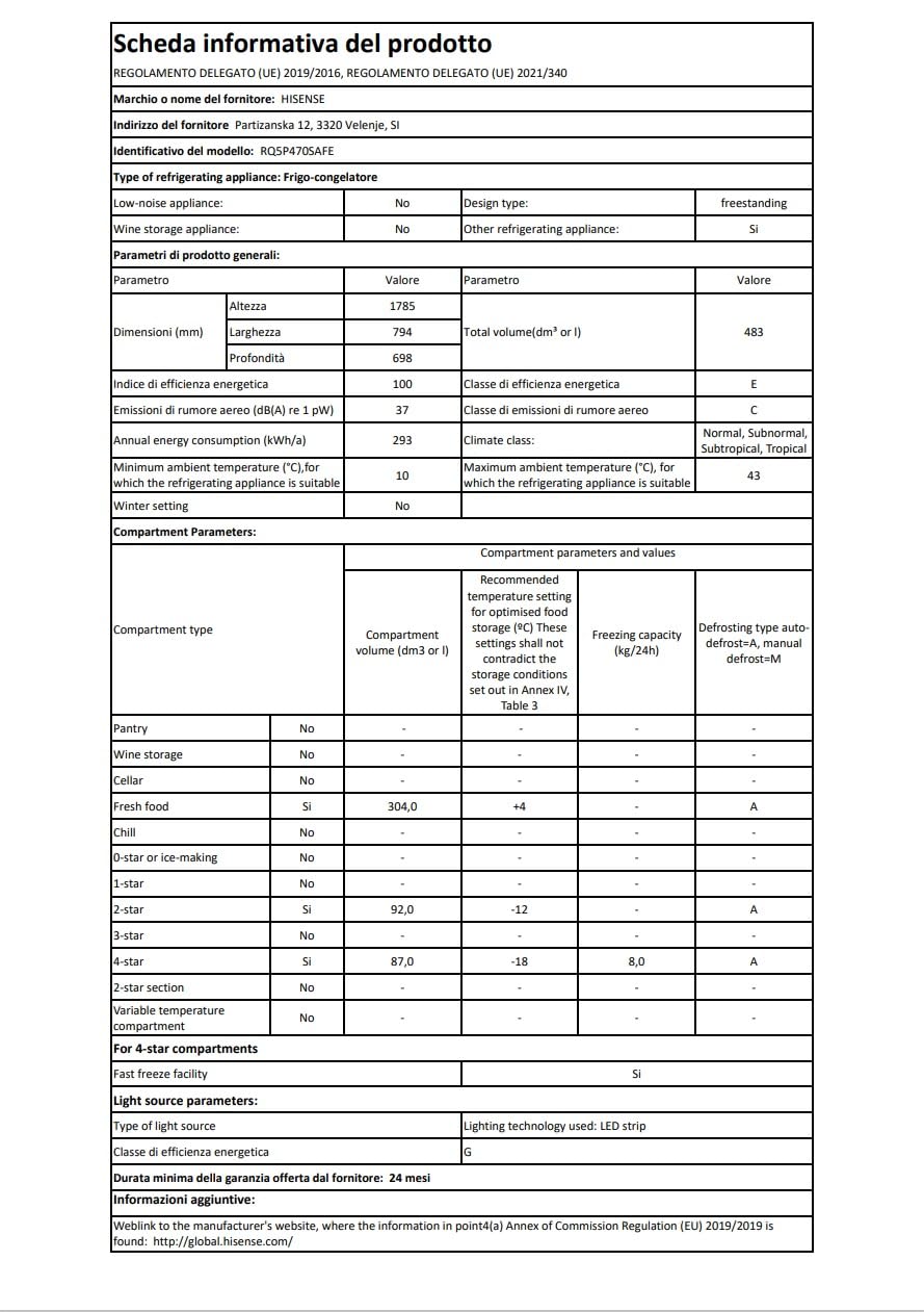 Descrizione Prodotto Hisense RF540N4SBF2 Compressore inverter – per una lunga durata. Total No Frost – mai più sbrinamento. Modalità vacanza. Attivando la funzione vacanza, il congelatore entra in modalità di risparmio energetico. Il resto del cibo congelato non può scongelare ed evitare inutili consumi. In questo modo il dispositivo di raffreddamento rimane completamente privo di ghiaccio.Modalità vacanza. Informazioni su Hisense: L'azienda Hisense, fondata nel 1969, è uno dei principali produttori mondiali di televisione, elettrodomestici (frigoriferi, lavatrici), condizionatori e elettronica di consumo. Segnale acustico di avvertimento se la porta è aperta troppo a lungo French-Door RF540N4SBF2 - Combinazione frigorifero e congelatore Si adatta alle vostre esigenze. Cooling Dual Tech Due circuiti separati per frigorifero e congelatore garantiscono temperature e livelli di umidità ideali per ogni area. Capacità netta 480 l: vano frigorifero 302 l, congelatore 178 l Equipaggiato con classe di efficienza energetica A++, 421 l di capacità e Total No Frost, questo modello di Hisense offre il comfort che stai cercando. Spazioso ed elegante – Il frigorifero Hisense RF540N4SBF2 con porta francese non solo convince per il suo bel design, ma anche per la più moderna tecnologia di congelamento. Equipaggiato con classe di efficienza energetica A++, 421 l di capacità e Total Per una lunga durata del dispositivo. Super funzione di congelamento. Hisense Rf540n4sbf2 Hisense RQ563N4SF2 Cross Door - Frigorifero Con Freezer, NoFrostPlus, Compressore Inverter, HolidayMode, SuperCool, 181 Cm, Frigorifero 294 L, Congelatore 160 L, 40 DB, 279 KWh/anno, Colore: Nero Hisense Rf540n4sbf2 Scheda Tecnica Spazioso ed elegante – Il frigorifero Hisense RF540N4SBF2 con porta francese non solo convince per il suo bel design, ma anche per la più moderna tecnologia di congelamento. My Fresh Choice - Cassetto Oltre alle zone di raffreddamento e congelamento, la temperatura può essere regolata individualmente nella gamma My Fresh Choice (da -20 °C a 5 °C). Total No Frost Grazie al sistema Multi-Airflow il cibo congelato viene raffreddato in aria fredda e l'umidità viene immediatamente dissipata. Classe di efficienza energetica