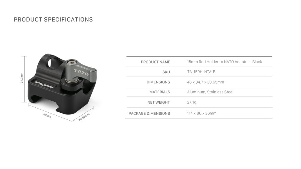 Rosette Adapter Tilta 15mm Single Rod Holder For Camera Cage Top TA TSRA 15 G Pro Max Montaggio laterale: questo design consente principalmente a questo supporto per asta di essere montato sul lato della maggior parte delle gabbie, ma può comunque essere montato in alto sulle gabbie per telecamere tramite binari NATO aggiuntivi. Compatibile con la maggior parte delle gabbie Tilta complete e mezza fotocamera. Mount a rod-mounted accessory onto your camera cage with this 15mm Rod Holder to NATO Clamp from Tilta . This mount features a single 15mm rod clamp on one side and a NATO Clamp on the other side to mount onto Tilta half or full camera cages . It provides Leggera: soluzione perfetta per l'uso del giunto cardanico e lenti compatte.