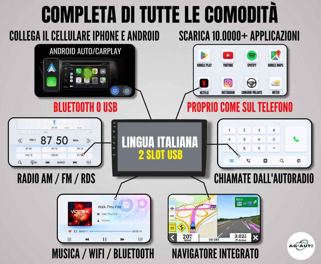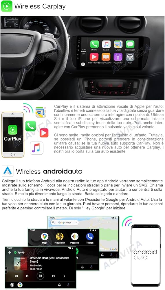 È possibile scaricare applicazioni di mappatura come Waze dal Play Store o ottenere la fonte di mappe offline dai fornitori di mappe per utilizzare la navigazione satellitare. Wireless Carplay e Android Auto: è sufficiente collegare il telefono iOS tramite Bluetooth con questo dispositivo principale Android per utilizzare CarPlay, collegare il telefono Android tramite USB o Bluetooth per utilizzare Android Auto. Seat Ibiza 2008-2015 Apple Carplay en Android navigatie | DSP sound | Qled 9-inch pleet uit voorraad leverbaar Autoradio android da 9 pollici con cavo adattatore dedicato e Canbus, senza bisogno di acquistare altro. Autoradio Android con copertura, per Seat Ibiza 2008-2015. 9 pollici autoradio Android Blu-ray Touch Screen. Supporto per la navigazione GPS: connessione a Internet Supporto per applicazioni di navigazione online e offline. È possibile effettuare chiamate, inviare/ricevere messaggi, ascoltare musica/podcast in CarPlay o Android Auto mentre ci si concentra sulla guida. Dimensioni: 270 (larghezza superiore) x 245 (larghezza inferiore) x 135 (altezza) mm. Per il 4g, il modem 4G è già incluso, basta inserire la scheda SIM 4G attiva e navigare liberamente in Internet. Nota: la nostra radio non è compatibile con la telecamera di retromarcia originale dell'auto. Telecamera di retromarcia Il nostro pacchetto viene fornito con una telecamera di retromarcia, compatibile con la nostra radio. Atoto A6pf DDKUS Autoradio Pour Seat Ibiza 2008-2015, Android 13 Autoradio 8 Core Autoradio Per Seat Ibiza Sistema operativo: Android 13, Processore principale (CPU): Processore Octa Core, RAM: 4G, ROM: 64G. Il modulo WiFi/4G integrato supporta gli hot spot wifi. Supporto radio FM: Radio FM/RDS di alta qualità con supporto per la scansione automatica delle stazioni e l'ascolto online di notizie, previsioni meteo e traffico. Supporto Bluetooth 5.0: È possibile riprodurre musica direttamente dall'iPhone e dal telefono cellulare Android. Descrizione prodotto DDKUS Autoradio per Seat Ibiza 2008-2015, Android 13 Autoradio 8 Core 4G+64G, 9 pollici Android Autoradio Blu-ray Touch Screen Supporto CarPlay e Android auto, supporto controllo del volante, DSP, split screen, radio FM, mirroring da smartphone, selezione multilingue, supporta DAB+ / retrocamera /DVR/4G wifi/TPMS/OBD/4K video. Bluetooth: È possibile riprodurre musica direttamente dall'iPhone e dal telefono cellulare Android. Navigazione GPS&4G/wifi: Supporto per mappe online/offline; disponibile per le app GPS online per Waze Sygic e altre app sul Play Store, o per recuperare la fonte di mappe offline dai fornitori di mappe per utilizzare la navigazione satellitare; è possibile utilizzare la navigazione mentre si ascolta la musica o la radio. È possibile effettuare chiamate, inviare/ricevere messaggi in CarPlay o Android Auto mentre ci si concentra sulla guida.
