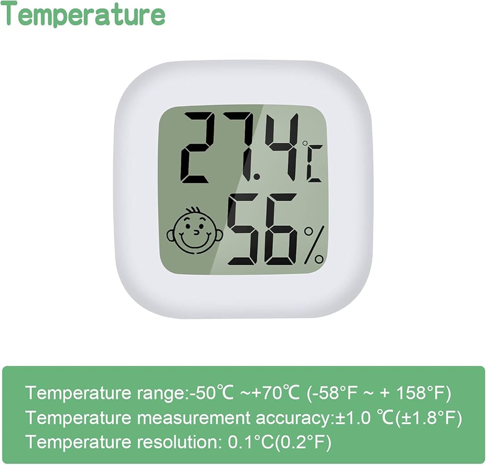 Termometro Cucina Termometro Igrometro Digitale LCD Con L'Icona Di Comfort [2 Pezzi][℃/℉]. Monitor Di Temperatura E Umidità Per Casa, Ufficio, Serra (bianco) : Amazon.it: Giardino E Giardinaggio Termoigrometro Digitale Il pacchetto include: - 4x termoigrometro Questo prodotto è destinato a una vita sana e non può essere utilizzato come strumento di misurazione. Il monitoraggio in tempo reale della temperatura e dell'umidità rende la tua casa più confortevole. È in grado di rilevare piccoli cambiamenti nell'aria 🧭Facile da leggere: lo schermo LCD ha un ampio display digitale di temperatura e umidità in tempo reale, il suo dispositivo portatile è progettato per il trasporto, il termometro mostra la temperatura in Fahrenheit o Celsius, il che è molto conveniente. 🧭Aggiornamento rapido: questo termometro igrometro portatile misura l'umidità e la temperatura interna, si aggiorna ogni 10 secondi, con dati di visualizzazione ad alta sensibilità e reattività e può rilevare rapidamente i cambiamenti della temperatura e dell'umidità interna. È ampiamente utilizzato in soggiorni, serre, sale strumenti, camerette, camerette, magazzini, cantine, cantine, ecc. 🧭Installazione semplice: il mini termometro igrometro per interni può essere utilizzato in molti modi, può essere posizionato su un tavolo o una libreria o fissato al muro con nastro biadesivo o fori per appendere. 🧭Misurazione ad alta precisione: intervallo di temperatura misurabile: -50 °C ~ +70 °C (-58 °F ~ +158 °F), campo di misurazione dell'umidità: 10%UR ~ 99%UR, precisione della misurazione dell'umidità: ±5% RH, precisione di misurazione della temperatura: ±1,0 °C (±1,8 °F), risoluzione della temperatura: 0,1 °C (0,2 °F).