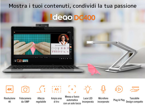Ideao DC400 offre una risoluzione fino a 4160×3120, grazie al sensore Sony da 13MP, che cattura anche le più piccole sfumature. Software Complementare Ideao DC400 Software della Fotocamera per Documenti Ideao VisualCam Istantanea & registrazione Per salvare la sessione Con il braccio flessibile, puoi regolare l'altezza come desideri. Perfetto per digitalizzare libri, dispense e appunti con facilità. Solo 4 passaggi per iniziare a utilizzare Collega e Usa Rimuovere la pellicola sull'obiettivo (solo per la prima volta) Passare un dito attraverso l'apertura alla base per sollevare leggermente la parte della videocamera, quindi tirare e inclinare la testa della videocamera e regolare l'altezza Condividi lo Schermo in Videoconferenza Condividere l'immagine da DC400 in modo chiaro e semplice Utilizzando VisualCam / IdeaoCam e condividendo lo schermo in software di videoconferenza come Zoom, WebEx e Teams, non solo puoi condividere l'immagine più nitida con partecipanti remoti, ma puoi anche utilizzare strumenti come lo schermo diviso e l'annotazione. Video 4K con colori vivaci]Il suo sensore SONY da 13 MP garantisce la qualità delle immagini e dei video sempre nitide e nitide. Uscita massima 3840x2880 pixel per l'acquisizione di immagini fisse di grandi dimensioni e 1920x1080 a 60fps per un'esperien 1080P / 60fps Cattura senza problemi le mosse che non vuoi perdere Se vuoi condividere operazioni importanti, come il lavoro a maglia, Ideao DC400, con la sua capacità 1080P / 60fps, può registrare i tuoi movimenti senza problemi. Perfetto per l'apprendimento ibrido, coaching online, demo dal vivo e videoconferenze. Suggest a change Per il processo di problem solving matematico Viene fornito con una custodia da viaggio da portare in giro. Luce LED a 3 livelli per ambienti più bui Luce LED Luce LED a 3 livelli incorporata. 1 tocco per attivare Pulsante di Autofocus Un leggero tocco sul pulsante AF attiva l'autofocus quando l'altezza del bersaglio cambia ed è necessario regolare la messa a fuoco. Area di tiro extra-ampia. Il braccio flessibile e l'obiettivo della fotocamera di alta qualità consentono di catturare facilmente l'intera pagina di un libro (area di ripresa in formato A3); o mettere a fuoco a soli 10 cm da vicino in modo da poter mostrare dettagli fini nell'arte ecc. Inizia a proiettare con il tuo software preferito Per istruzioni online/ibride e in loco Per libri di testo, oggetti 3D ed esperimenti Con un semplice righello Stabilizzatore Il design dello stabilizzatore impedisce efficacemente all'Ideao DC400 di cadere in avanti a determinate angolazioni. La confezione include Ideao DC400, cavo USB (con passacavo), borsa per il trasporto e guida rapida Supera il 4K e mostra la tua creatività con estrema chiarezza. Ideao DC400 è una fotocamera / visualizzatore di documenti 2 in 1 e una webcam che offre una risoluzione 4K cristallina. Eppure la costruzione è robusta ed equilibrata, anche quando il braccio è completamente esteso. Lavora con qualsiasi software di videoconferenza di tua scelta, inclusi Zoom, Google Meet e Microsoft Teams Converti facilmente documenti scansionati in PDF ricercabili, estrai e copia il testo oppure esporta i contenuti per modificarli e condividerli. Puoi fare videochiamate faccia a faccia. 【Scatena la creatività con IDEAOCAM (Chrome Extension per Mac, Windows, Chromebook) 】Scattare istantanee, registrare un video, zoomare per riprese ravvicinate, creare video stop motion e connettersi con il tuo account Google Drive o Google Classroom per organizzare facilmente i file! Anche campioni di insetti come questi possono essere chiaramente visualizzati e condivisi con partecipanti remoti. Gli oggetti vengono sempre catturati con un'immagine nitida. Webcam Pc Ideao DC400 4K USB Visualiseur Classe, Webcam & Scanner Document, 3-en Macchina Fotografica Digitale App di Estensione di Chrome IdeaoCam Come app di estensione per Chrome, IdeaoCam funziona con Windows, Mac e Chromebook. Funzione OCR Crea PDF ricercabili con l’OCR La funzione OCR di Ideao VisualCam converte le immagini scansionate in file PDF ricercabili, permettendo di cercare, copiare ed esportare facilmente il testo. Uscita massima 3840x2880 pixel per l'acquisizione di immagini fisse di grandi dimensioni e 1920x1080 a 60fps per un'esperienza visiva più fluida. Video Realistici con Ideao DC400 Mostra oggetti e qualsiasi lavoro con grande chiarezza e colori vivaci Sistema operativo : Windows 11, 10. macOS 10.15 o successivo. Chrome OS Con il microfono integrato, puoi utilizzare Ideao DC400 anche come webcam. Nota: guarda i nostri video tutorial se vedi video specchiati durante le videoconferenze. 【Potente funzionalità OCR】Sblocca tutto il potenziale di Ideao VisualCam con il supporto OCR integrato per oltre 100 lingue. Dalla dimostrazione e progettazione online di prodotti, la distanza di ripresa flessibile di Ideao garantisce una qualità video eccezionale! Documenti di progetto, utilizzati come webcam Documenti e campioni possono essere facilmente e chiaramente condivisi in tempo reale. 【Document camera, webcam pc e scanner documenti 3 in 1】Il design regolabile del supporto consente la flessibilità di scattare in alto come visualizzatore o frontale come webcam per videochiamate. Ampia Area di Tiro Area di ripresa A3 per darti spazio sufficiente per dimostrare i tuoi contenuti. Con l'integrazione dell'account Google, puoi accedere e salvare foto e video direttamente su Google Drive o Google Classroom. Distanza di messa a fuoco estremamente ravvicinata: il braccio flessibile e l'obiettivo della fotocamera di alta qualità consentono di catturare facilmente l'intera pagina di un libro (area di ripresa formato A3) o di concentrarsi a soli 10 cm di distanza, quasi come i video macro. Sempre Nitido e Chiaro con l'autofocus Autofocus one-touch per rimanere sempre nitidi Ideao DC400 è dotato di messa a fuoco automatica. 【Video 4K con colori vivaci】Il suo sensore SONY da 13 MP garantisc