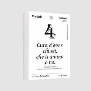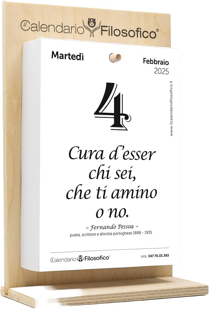 FORMATO DA TAVOLO: La versione che stai guardando ora è il formato A4 e misura cm 21x30. Completa di supporto in legno di betulla. Per qualsiasi cosa puoi parlare direttamente con loro Calendario Con Frasi Del Giorno 2025 Il 2025 Con Supporto In Legno, Formato A5 Da 15x21 Cm, Il Primo E L'Originale Calendario Da Tavolo Con 365 Giorni Di Frasi Filosofiche, Leggi Ogni Giorno Una Frase Calendario Filosofico Ogni giorno Sofia e Massimo scelgono per te, con passione da 9 anni, una frase per invitarti a riflettere, cambiare, osare e migliorare. In ogni pagina del calendario trovi il numero di telefono di Sofia e Massimo. IDEA REGALO: IL Calendario Filosofico è un regalo lungo un anno: ideale per un’amica o un amico speciale, per la mamma, per il papà, per Natale e San Valentino. FORMATO DA TAVOLO: La versione che stai guardando ora è il formato A6 e misura 10x14 cm. Comprende il supporto da tavolo in legno di betulla di 12x19 cm. Il supporto può essere riutilizzato per i calendari degli anni successivi, acquistabili separatamente Da leggere, conservare e condividere con chi vuoi IL PRIMO, L'ORIGINALE: Prodotto artigianalmente a Bologna dal 2015, il Calendario Filosofico è stato il primo calendario da tavola con frasi filosofiche e vanta numerosi tentativi di imitazione. Il supporto può essere riutilizzato per i calendari degli anni successivi, acquistabili separatamente