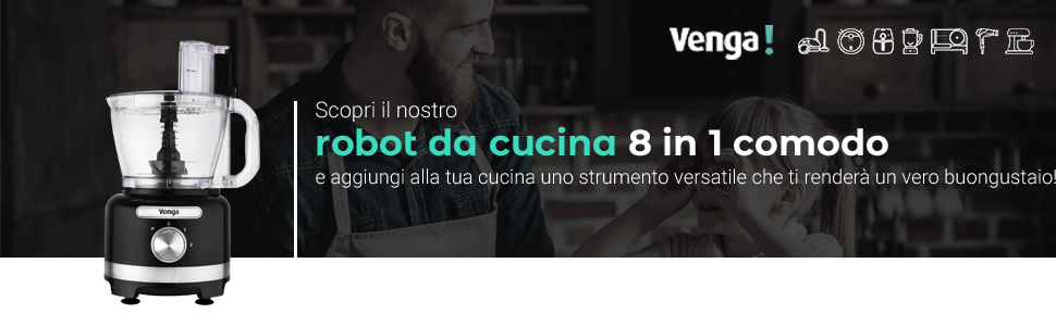 Questa versatilità combinata con il potente motore da 1000 W permette la preparazione impeccabile di una grande varietà di ricette, mentre i piedini antiscivolo mantengono il robot da cucina saldamente in posizione Frullare, impastare, tritare, tagliare, sminuzzare, affettare e spremere: tutto in un unico apparecchio versatile IL ROBOT DA CUCINA 8-IN-1 FOOD PROCESSOR è uno strumento molto utile in qualsiasi cucina. Potente unità di elaborazione Con una grande potenza di 1000 W, il VG HA 3001 sminuzza senza sforzo ingredienti duri e impasta pane e pizza, mentre i piedini antiscivolo aiutano a mantenere l'apparecchio saldamente in posizione. Per grandi quantità di liquidi, è meglio usare la caraffa del frullatore, poiché il coperchio della ciotola del robot da cucina non è a prova di perdite come il coperchio del frullatore. Robot da Cucina 8 in 1, Ciotola da 3 L, Frullatore da 1,75 L, 2 Impostazioni di Velocità, Impostazione Impulso, 1000 W, Nero/Argento, VG HA 3001 Visita lo Store di Venga! 4,0 4,0 su 5 stelle 60 voti Il motore alimenta le 2 impostazioni di velocità e l'impostazione a impulsi del robot da cucina, dandoti il controllo completo dell'apparecchio. Spintore 3 in 1 Lo spintore 3 in 1 può essere adattato alle dimensioni degli ingredienti che si stanno aggiungendo. MOLTO VERSATILE: Impasta con la lama per la pasta, trita la carne e le verdure con la lama per tritare, taglia le patate a chips con il disco da taglio, sminuzza il cavolo e le carote con il disco per sminuzzare, affetta i cetrioli o le mele in fette grezze o fini con i due dischi per affettare, e spremi arance e altri agrumi con lo spremiagrumi La caraffa del frullatore ha una capacità di 1,75 L, quanto basta per riempire 7 tazze, abbastanza grande per fare frullati per tutta la famiglia! Usa sempre lo strumento giusto per il lavoro! Gli ingredienti più sottili come le carote e il sedano devono essere spinti attraverso una bocchetta di alimentazione in modo che entrino nella ciotola verticalmente, mentre gli ingredienti più spessi, come un blocco di formaggio, si adattano solo attraverso la grande bocca di alimentazione. Robot Da Cucina Potente Frullatore A Immersione Venga! Robot Da Cucina 8 In 1, Ciotola Da 3 L, Frullatore Da 1,75 L, 2 Impostazioni Di Velocità, Impostazione Impulso, 1000 W, Nero/ Argento, VG HA 3001 Robot Da Cucina Lidl Tagliaverdure Elettrico Inoltre, lo spintore 3 in 1 aiuta a ottenere la giusta dimensione per aggiungere gli ingredienti Con l'impostazione a impulsi, puoi anche mettere l'apparecchio a velocità turbo per brevi raffiche. 2 IMPOSTAZIONI DI VELOCITÀ E IMPULSO per fornire ancora più versatilità, permettendoti di frullare ad alta velocità e impastare a bassa velocità.