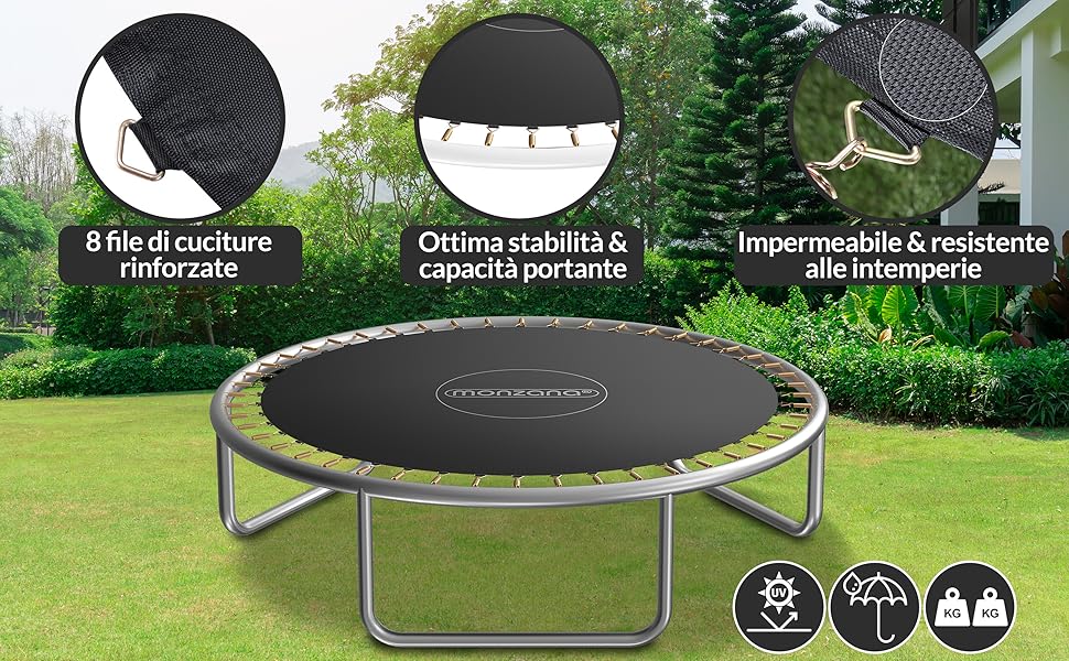 Contenuto della confezione: 1 tappetino di ricambio per trampolino (con strumento di montaggio). Si adatta alle vostre esigenze: il nostro telaio rotondo trampolino a rete vi offre 3 specifiche per voi a scelta, ha dimensioni da 8, 10 e 12 piedi si adatta in ogni caso alle vostre esigenze. Trampolino Elastico Ricambi Kit Molle Di Ricambio In Acciaio Per Trampolini Elastici | Leroy Merlin Rete Protezione HTYG Tappeto da Salto per Trampolino, Tappeto Elastico Telo Ricambio Trampolino, Compatibile con telai di Tutte Le Marche e Modelli, Rimbalzo Perfetto Dimensioni pennino: 5,5 pollici Cuscinetto di carico: 250 kg. Impermeabile e resistente ai raggi UV: il nostro tappetino di ricambio per trampolino è impermeabile, resistente ai raggi UV e traspirante, per sopportare tutti i tipi di condizioni atmosferiche all'aperto. Inoltre può essere facilmente conservato. 10ft-64 V-Ring: Dimensioni tappetino: 103,2 pollici. È perfetto per molte attività divertenti come allenamento, salti competitivi, ginnastica e altro ancora. Facile da montare e da riporre: è facile montare la rete di ricambio del trampolino sul telaio del trampolino, senza spendere molto tempo ed energia. Descrizione: Nome: tappetino di ricambio per trampol A: 8 piedi - diametro 2,44 metri (48 fibbie) B: 10 piedi - diametro 3,06 metri (54 fibbie) C: 10 piedi - diametro 3,06 metri (56 fibbie) D: 10 piedi - diametro 3,06 metri (60 fibbie) E: 10 piedi - diametro 3,06 metri (64 fibbie) E: 10 piedi - diametro 3,06 metri (64 fibbie) Anelli da 8ft-48 V: Dimensioni tappetino: 79,1 pollici. Dimensioni pennino: 6,5 pollici Cuscinetto di carico: 350 kg. Dimensioni pennino: 5,5 pollici Cuscinetto di carico: 300 kg. 10ft-54 V-Ring: Dimensioni del tappetino: 103,2 pollici.