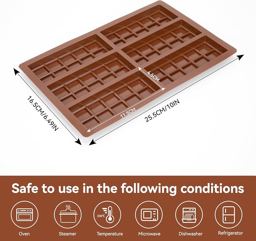 Resistente al Calore: Può resistere a un intervallo di temperatura da -40 a 230 gradi, sicuro da usare in forno, microonde, lavastoviglie, frigorifero, congelatore, sentiti libero di goderti prelibatezze molto più sane. Materiale di Sicurezza: Lo stampo per cioccolato è realizzato in materiale siliconico alimentare, non tossico e inodore, ha una buona elasticità, non si strappa facilmente, può essere utilizzato a lungo. Stampi In Silicone Per Cioccolatini 24 Stampi Per Cioccolato In Silicone A Cavà Utensili Da Forno Stampi In Silicone Per Pasticceria Caratteristiche: - Facile da pulire, basta lavarlo con acqua calda e sapone o metterlo in lavastoviglie, puoi piegarlo quando non lo usi, risparmiando spazio. - Realizzato in materiale siliconico di alta qualità, sicuro da usare, flessibile e antiaderente, facile da sformare con una semplice rotazione e una leggera spinta. Facile da Usare: Lo stampo per caramelle in silicone è flessibile e antiaderente, basta premere leggermente per far scoppiare il prodotto finito, semplice da usare e da pulire, risparmia tempo, divertiti di più con i dessert fai-da-te. Stampi per Cioccolato Stampi in Silicone Caramelle Set Antiaderenti Attrezzo Accessori 6 Cavità Marrone Regalo per Cucina Cottura al Forno Fatto a Mano Cialde Energetiche Barretta - Perfetto per fare cioccolato, biscotti, caramelle, gelatine, gommose, cubetti di ghiaccio e tutti i dessert che desideri, può anche essere usato per sciogliere la cera. - Gli stampi per barrette di cioccolato sono di grande flessibilità e utilità, non si deformano nemmeno ad alte temperature, durevoli da usare. Multifunzionale: Non solo adatto per fare il cioccolato, può anche essere usato per caramelle, mousse, gelatine, budini, dolcetti allo yogurt gelato, cubetti di ghiaccio con succo di frutta, decorazioni per torte, ecc.