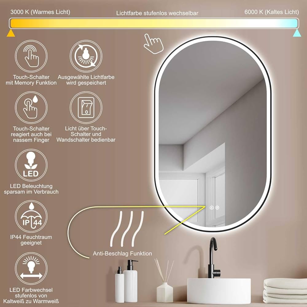 ovale specchio miroir bain salle bagno falper specchi Versatile e pratico da usare: 50 x 90 cm, lo specchio offre una dimensione ideale per qualsiasi stanza. Nota: nessuna funzione di memoria! Comandi a sfioramento intuitivi: regola la temperatura e la luminosità della luce con un innovativo interruttore a sfioramento, intuitivo e facile da usare, per la massima flessibilità. L'installazione è semplice e consente di risparmiare tempo prezioso. Specchio Da Parete Rotondo Gaommini Specchio Ovale Sospeso A Soffitto Specchio Decorativo In Vetro Galleggiante In Metallo Nero Per Bagno - Specchio Cosmetico Da Parete Con Doppio Braccio (Size : 40cmx70cm Specchio Led Retroilluminato Ovale Facile installazione senza sforzo: lo specchio si collega direttamente a una presa di corrente, senza cavi ingombranti.