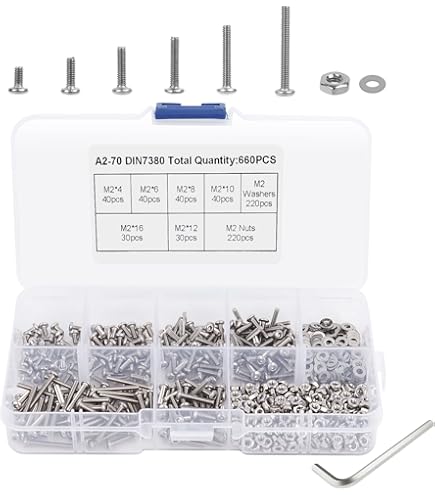 Applicazione multi-scena: ampiamente utilizzato in campi di installazione o manutenzione come aerospaziale, ferrovie ad alta velocità, navi, automobili, macchinari, macchine, computer, mobili, decorazioni per la casa, stampa 3D, progetti fai da te, ecc. 720 Pz M2 M3 M4 Kit Bulloni e Dadi, Set di Viti Bulloni e Dadi a Testa Cilindrica a Torx, Viti a Testa Tonda Torx, Kit di Assortimento Vite a Testa Bottone Torx, Bulloni Viti per Macchine ✅ Ampiamente utilizzato in settori di installazione o manutenzione come aerospaziale, ferrovie ad alta velocità, navi, automobili, macchinari, computer, mobili, decorazioni per la casa, ecc. ✅ La combinazione di dadi e rondelle aumenta la superficie di contatto, riduce la forza di trazione e protegge viti e parti. ✅ Tutti i set di viti M2 sono forniti in una scatola di immagazzinaggio per un facile accesso e stoccaggio. Viene fornito con dadi e rondelle: i dadi esagonali consentono un'installazione più precisa, un migliore serraggio e il trasporto di carichi maggiori. La confezione include: 720 pezzi in totale, 40 pezzi di ogni dimensione: M2 x 4 mm, M2 x 6 mm, M2 x 8 mm, M2 x 10 mm, M2 x 12 mm, M2 x 16 mm, 240 pezzi di dadi M2, 240 pezzi di rondelle M2 e 1 chiave inglese, quantità sufficiente e dimensioni ricche per soddisfare le esigenze di più scenari e campi. Materiale squisito: il set di dadi e bulloni m2 è realizzato in acciaio inossidabile di alta qualità, robusto, non facile da rompere o danneggiare, resistente alla corrosione, antiruggine e antigraffio, che garantisce una lunga durata e stabilità. Le filettature sono chiare, il passo è uniforme, la forza è stabile ed è facile da usare. Fare riferimento al prodotto effettivo. Set Brugole K Vi A Testa Cilindrica Con Esagono Incassato Nero Fino A 720 M2 M2.5 M3 M4 M5 M6 M8 M10 Set Di Assortimento Di Vi A Brugola DIN912 In Acciaio 12.9 Viti Per M2 Grazie per la comprensione. Promemoria: I colori possono variare leggermente dalle immagini online a causa delle impostazioni del colore del monitor.