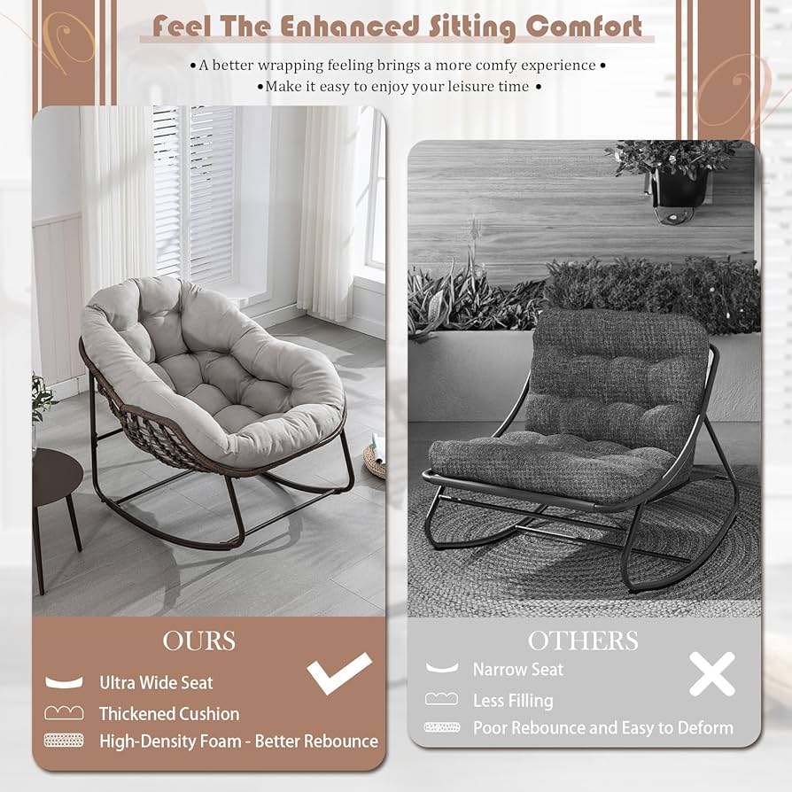 Rocking Chair UPHA Oversized Wicker Egg Chair Indoor Outdoor Large Lounge Chair With Red Cushions Jdy Red The Chai Lo spessore del tappetino da 6 nelle sedie a forma di egg, il riempimento ad alta densità e qualità rendono i cuscini più morbidi e non deformati. Outdoor Rocking Chair, 94.5*111*80cm, Patio Oversized Wicker Egg Rocking Chair, Indoor & Outdoor Comfy Rocker Chair with Thick Cushion, Modern Lounge Chair for Balcony, Front Porch, Garden (Grün) von SUKY . Our grand patio rocking chair offers an extra wi Whether you're enjoying a book or sipping your favorite beverage, our chair's cushion will provide exceptional comfort Il cuscinetto anti-tipping per i piedi e le strisce antiscivolo della parte inferiore garantiscono un tempo sicuro e silenzioso La nostra sedia a dondolo per patio è progettata per un facile montaggio, forniamo anche video e istruzioni di installazione che consentono di impostarla rapidamente ed efficacemente. Assicurati che la tua sedia mantenga il suo aspetto attraente oltre il tempo The royal rocking chair with breathable fabric covery, which is resistant to fading, wear and easy to clean, even if your pet has sharp claws.