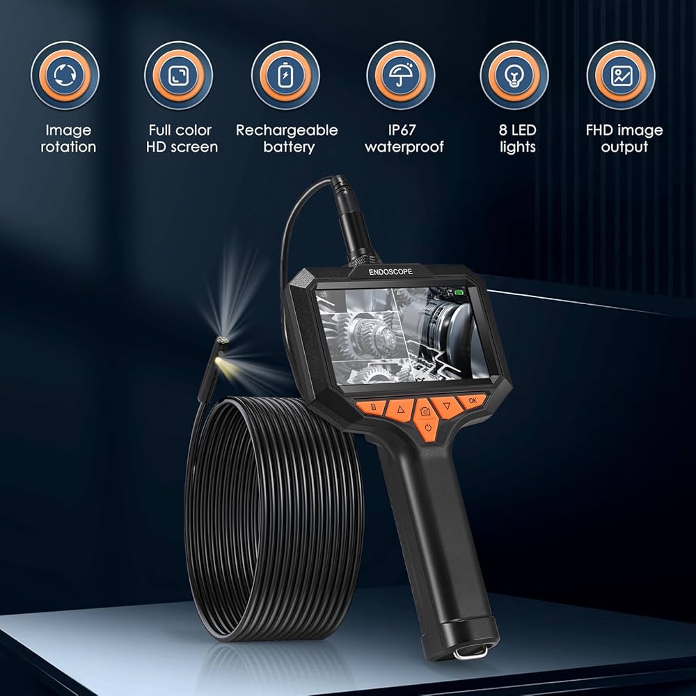 Le luci LED regolabili assicurano visibilità in ambienti bui, essenziale per meccanici, addetti alla manutenzione, bricolage e idraulici. Lo schermo a colori da 4,3 pollici offre immagini nitide in tempo reale. Telecamera di ispezione professionale] 8 luci LED regolabili per garantire un'immagine chiara anche in condizioni di oscurità. La migliore distanza di messa a fuoco (2 cm-10 cm) facilita le ispezioni. ... 1920P HD Telecamera Endoscopica Snake, Telecamer Cannucce Vetro Telecamera Per Endoscopio Industriale, Telecamera A Serpente 1080P Con Luci A Led Cavo Semirigido Per Automobili Motori Ispezione Di Scarico 39 Mm 5 M 164 Pi Telecamera Endoscopica Scheda Tecnica 【Facile da usare】 La endoscopio professionale di ispezione con luce si attiva facilmente con una semplice accensione, senza app o Wi-Fi. Nota: non supporta scheda SD, registrazione video o acquisizione foto. Il corpo opaco antiscivolo garantisce una presa sicura, mentre il cavo rimovibile aggiunge portabilità. 【Elenco prodotti】 Fotocamera Snake 5M con accessori (gancio1, magnete1, specchietto laterale1, fibbia di fissaggio3) e cavo Type-C. 【Endoscopio con schermo IPS da 4,3''】Sperimenta una visione chiara con i pixel HD 1920x1080P della telecamera endoscopica.
