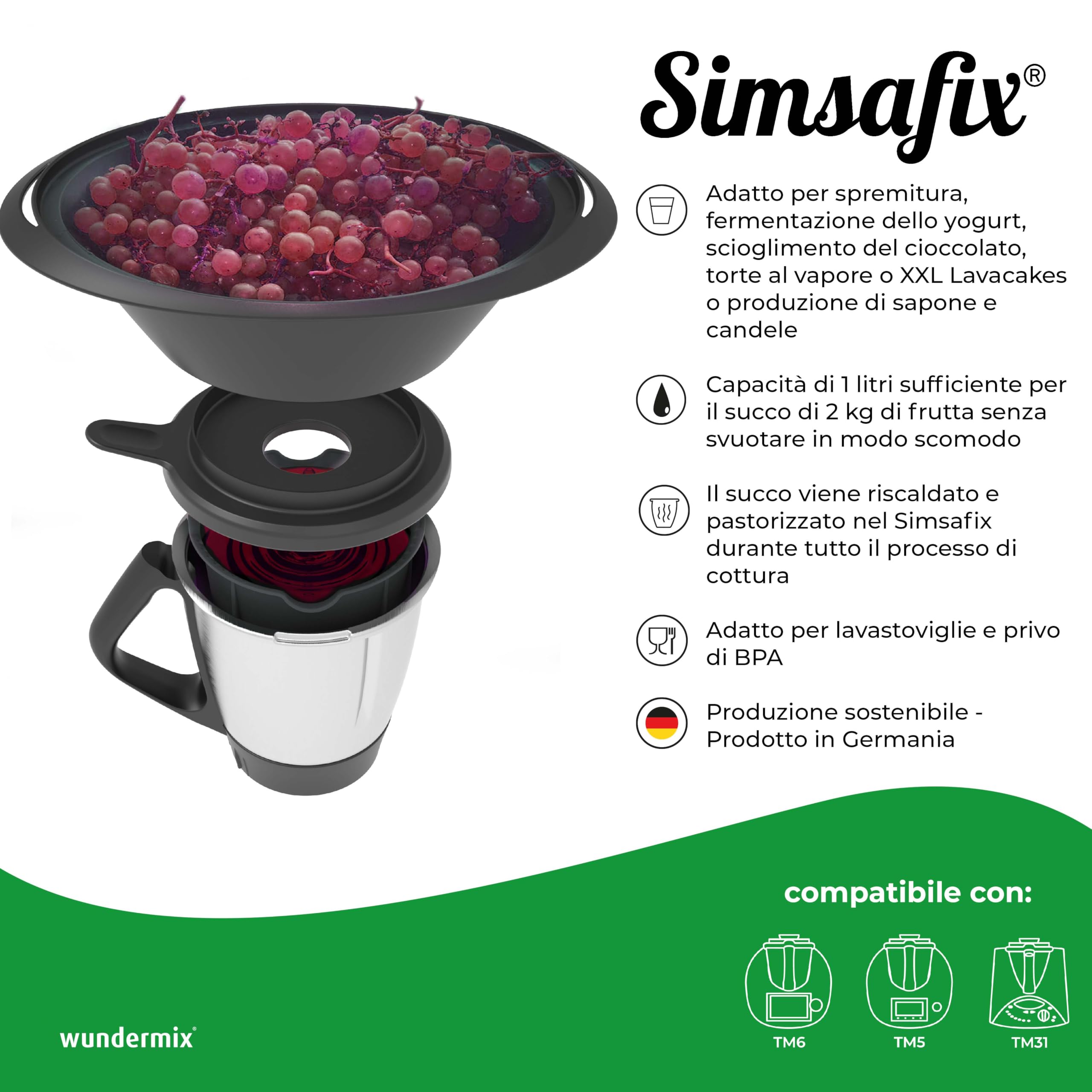Monsieur Cuisine non è solo un robot da cucina di prim'ordine con numerose funzioni. Il nostro consiglio: con l'estensione dell'accessorio per vaporizzatore MaxiSteam, è possibile spremere efficacemente anche più frutta contemporaneamente. Entsafterbehälter zum Einsetzen in den Mixtopf des Monsieur Cuisine Connect; Auch für Joghurt-Fermentation, Schokolade schmelzen, gedämpfte Kuchen oder XXL Lavacakes oder Seifen- & Kerzenherstellung einsetzbar; 1,2 Liter Fassungsvermögen ausreichend für S Dare libero sfogo alla creatività abbinando diversi tipi di frutta, secondo il motto: tutto ciò che ha un buon sapore è permesso! Tuttavia, se prima bisognava mettere le ciotole nel cestello di cottura per raccogliere il succo estratto, la spremitura a vapore con Simsafix è facile e comoda. Posizionare l'accessorio per la cottura a vapore e riempire con un massimo di 2 kg di frutta o verdura lavata e chiudere con il coperchio dell'accessorio per la cottura a vapore. Inserto spremiagrumi a vapore per Monsieur Cuisine Connect, Trend, Smart Il succo nel Simsafix è anche riscaldato ad alte temperature e pastorizzato durante il processo di cottura. Il tuttofare può essere utilizzato anche come spremiagrumi a vapore per la lavorazione del raccolto annuale di frutta! Ideale anche come regalo per chi ha un Monsieur Cuisine. Funzioni aggiuntive di Simsafix: Fermentare lo yogurt con Simsafix - senza impilare i vasetti nell'accessorio per la cottura a vapore Rimozione sicura dalla pentola con la spatola, Il succo è altamente riscaldato e pastorizzato nel Simsafix durante tutto il processo di cottura Facile spremitura senza spremiagrumi. La spremitura a vapore con Simsafix è divertente, semplice, efficace e di sicuro successo. VERSATILE NELL'USO - L'estrattore di succo Simsafix è adatto per la spremitura a vapore, ma anche per fare lo yogurt, fondere il cioccolato, preparare torte al vapore, tortine con ripieno caldo XXL, saponi o anche candele. INSERTO ESTRATTORE DI SUCCO A VAPORE PER MONSIEUR CUISINE - Il nostro Simsafix è il complemento perfetto per preparare succhi di frutta e verdura, gelatine, marmellate, liquori e molto altro ancora. Con la sua capacità di 1,2l, l'estrattore di succo a vapore è sufficiente per ottenere il succo da 2 kg di frutta senza doverlo svuotare tra un caricamento e l'altro. Simsafix offre molte altre applicazioni. Non è nemmeno necessario rimuovere buccia, semi e gambi, come spesso accade con gli spremiagrumi e centrifughe. Simsafix è il complemento perfetto per preparare succhi di frutta e di erbe, gelatine, marmellate, liquori e molto altro ancora. Basta svuotare il Simsafix di volta in volta e continuare! IL NOSTRO CONSIGLIO DELL'ESPERTO WUNDERMIX - Con la nostra estensione dell'estrattore di succo al vapore MaxiSteam per Monsieur Cuisine è possibile spremere efficacemente ancora più frutta in una sola volta. Prelevare il succo con la spatola e trasferirlo dal bordo. Spremiagrumi Manuale Ribelli Estrattore Di Succo A Vapore Estrattore Induzione Acciaio Inox Pentola A Vapore Per Frutta E Verdura Estrattore Succo 17 L Spremiagrumi Elettrico SICURO E PULITO - Il succo rimane nel Bimby finché non viene rimosso con la spatola nel Bimby e il pratico beccuccio di versamento assicura un travaso pulito e senza sgocciolamenti. Capacità di 1,2 L è sufficiente per ottenere il succo di 2 kg di frutta senza svuotamento intermedio MADE IN GERMANY - Simsafix è stato prodotto in modo sostenibile in Germania ed è anche resistente al calore fino a 120°C, privo di BPA e lavabile in lavastoviglie. Da inserire nel recipiente del Monsieur Cuisine Connect, Trend & Smart. Sciogliere il cioccolato e la pentola rimane pulita Il succo defluisce nella pentola, si raccoglie nel Simsafix e può essere facilmente rimosso con la spatola al termine della cottura. L'accessorio MC dell'anno con numerose funzioni!
