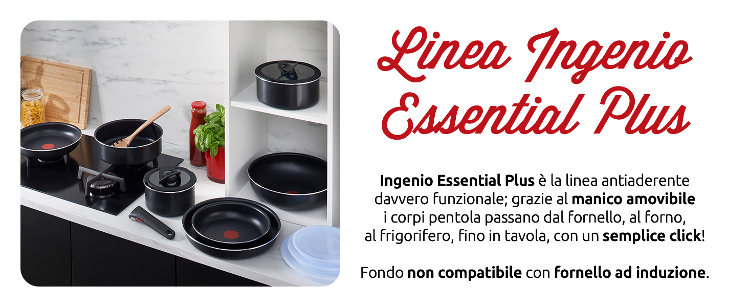 Ingenio: multiuso, monomanico, salvaspazio! Prodotto 2: FORMA ERGONOMICA: Il manico è confortevole e sicuro grazie alla forma dal design ergonomico e ai 3 punti di fissaggio Lagostina Ingenio Mineralis Lagostina Ingenio Essential Padella Per Gas E Forno, Alluminio, Nero Lagostina Ingenio Essential Plus IN ALLUMINIO: Padella realizzata in alluminio con rivestimento antiaderente e fondo serigrafato con colore a contrasto; lavabili in lavastoviglie. Garantite 5 anni, 10 anni per i manici Garantite 5 anni, 10 anni per i manici. Il manico non è adatto alle cotture in forno. Prodotto 1: INDICATORE DI CALORE: L'indicatore Thermosignal al centro della padella cambia colore quando si è raggiunta la temperatura giusta per iniziare la cottura, per ricette cotte sempre a puntino Elemento distintivo della linea è il manico amovibile, compatibile con tutti i corpi pentola, è confortevole e sicuro grazie alla forma dal design ergonomico e ai 3 punti di fissaggio, e resistente fino a 10 kg. Garantite 5 anni, 10 anni per i manici Prodotto 1: VERSATILI: Grazie al manico Removibile, tutti i corpi pentola sono adatti per cotture su gas e al forno fino a 250 °C (non adatto all'induzione) per la conservazione in frigo e per servire a tavola; le pentole sono impilabili e occupano poco spazio per essere riposte facilmente Lagostina Ingenio Essential Plus Padella Ø 28 cm, Padella Antiaderente in Alluminio per Gas e Forno, con Indicatore di Cottura Thermosignal, Utilizzabile con Manico RemovibilePadella realizzata in alluminio con rivestimento antiaderente e fondo serigrafato con colore a contrasto; lavabili in lavastoviglie. Ingenio è adatto per passare dal piano cottura, al forno, al frigo, è ideale per servire il cibo direttamente in tavola ed in più è salva spazio perchè perfettamente impilabile. Grazie al manico Removibile, tutti i corpi pentola sono adatti per cotture su gas e al forno fino a 250 °C (non adatto all'induzione) per la conservazione in frigo e per servire a tavola; le pentole sono impilabili e occupano poco spazio per essere riposte facilmente. Il rivestimento antiaderente di alta qualità Titanium non fa attaccare i cibi, è sicuro e durevole, rinforzato per una maggiore resistenza all’uso di utensili metallici e facile da pulire; senza PFOA, cadmio e piombo.