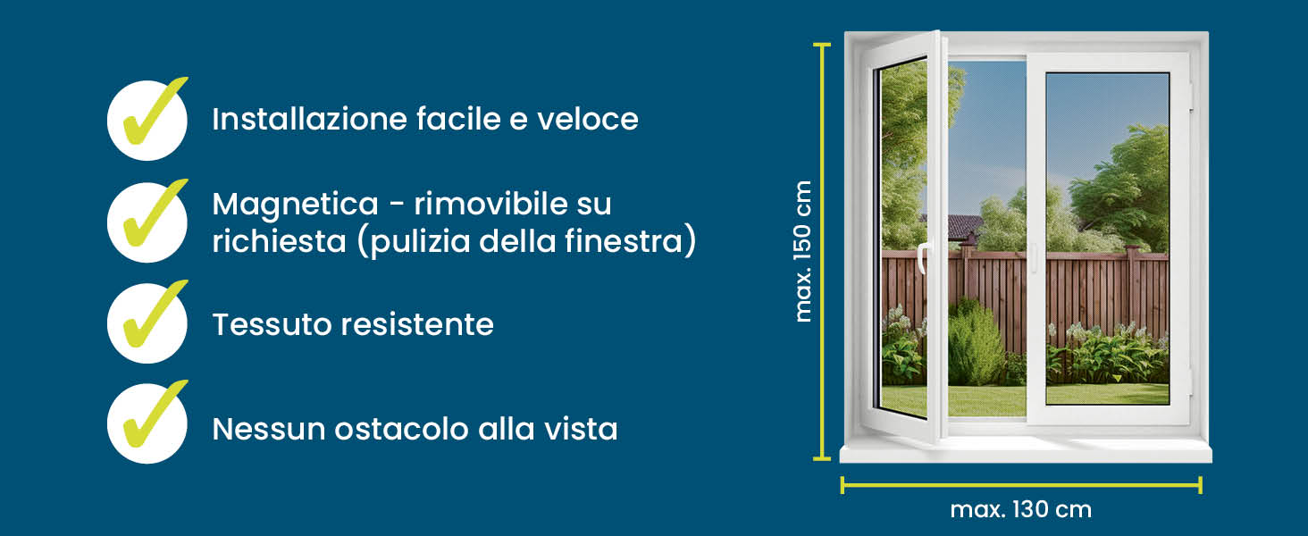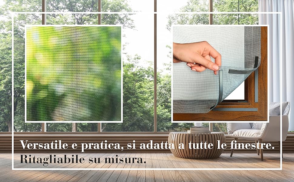 La zanzariera magnetica con chiusura automatica sarà pronta a svolgere il proprio lavoro, in totale autonomia e con stile Questa zanzariera universale garantisce una perfetta compatibilità e adesione con tutte le finestre Zanzariera Magnetica Finestra , Innovativo Fissaggio Con Magneti - Made In Italy, Rete In Vetroresina Resistente E Ritagliabile Su Misura (130x150 Cm Zanzariera Per Finestre Senza Buchi Le migliori offerte per Zanzariera Magnetica Finestra, Rete in Vetroresina Resistente - Made in Italy sono su Confronta prezzi e caratteristiche di prodotti nuovi e usati Molti articoli con consegna gratis Grazie al suo pratico sistema magnetico, una volta posizionata sulla finestra potrai aprirla, chiuderla e rimuoverla se necessario, in modo semplice e veloce. PROTEZIONE E RISPARMIO - Questa zanzariera magnetica professionale proteggerà la tua casa da zanzare e insetti fastidiosi che altrimenti potrebbero entrare dalla finestra aperta e al contempo favorirà un miglior afflusso e ricircolo di aria fresca, oltre ad una maggiore quantità di luce naturale, permettendo di ridurre l’utilizzo di illuminazione artificiale e aria condizionata, aumentando così il risparmio energetico COMPATIBILE CON TUTTE LE FINESTRE - Appositamente sviluppata per essere utilizzata su tutte le finestre di casa e non solo, grazie alla possibilità di essere ritagliata di qualsiasi forma e dimensione e grazie anche all’unicità delle strisce magnetiche indipendenti, potrà essere utilizzata anche su finestre, finestrini e oblò di camper e barche. QUALITÀ SUPERIORE - Zanzariera magnetica dotata di potenti magneti, resistenti, flessibili e antirottura, con rete composta da vetroresina rivestita in pvc, per una maggiore resistenza allo strappo, agli animali domestici e agli agenti atmosferici come vento, pioggia e raggi UV. MADE IN ITALY - Se c’è da sempre qualcosa che ci contraddistingue è la qualità, il design e la cura dei dettagli. Il nostro prodotto è realizzato in Italia e rispecchia tutte queste caratteristiche, non lasciando nulla al caso. LA ZANZARIERA MAGNETICA DALLO STILE UNICO - MADE IN ITALY Zanzare e insetti fastidiosi in casa? Non preoccuparti, questa zanzariera è stata appositamente sviluppata per tenere fuori casa zanzare e tutti quei fastidiosi insetti che altrimenti potrebbero entrare dalla finestra aperta. Una volta ritagliata la rete su misura della tua finestra con delle semplici forbici, basterà applicare le strisce magnetiche sulla cornice della finestra e sulla zanzariera grazie ai potenti adesivi di cui sono dotate. Il segreto sta nei super magneti indipendenti, infatti i magneti sono separati in più segmenti doppi, permettendo l'applicazione della zanzariera anche su superfici con ostacoli o irregolari, garantendo sempre la massima tenuta, a differenza di quello che succederebbe con una striscia unica magnetica o in velcro, che renderebbe l'applicazione impossibile su una cornice non perfettamente piana o con ostacoli sulla finestra. Nessuna fastidiosa e scomoda striscia in velcro da applicare al bordo della finestra, si installa grazie alle strisce magnetiche indipendenti da posizionare sul bordo della finestra e sul bordo della zanzariera, dotate di un adesivo resistente ai raggi UV solari e in grado di aderire saldamente su ogni tipo di superficie, senza danneggiarla in caso di rimozione.
