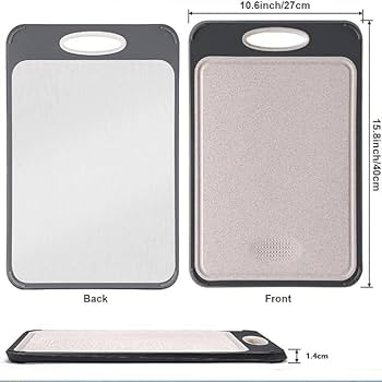 È leggera e facile da maneggiare, adatta a vari ambienti di cucina. Per ottenere il miglior risultato di pulizia, si consiglia di posizionare la faccia in acciaio inossidabile rivolta verso il basso o in posizione verticale. Le migliori offerte per Tagliere in Acciaio Inox Su Entrambi I Lati per Carne, Pane, Verdura, Frutta, Ta sono su Confronta prezzi e caratteristiche di prodotti nuovi e usati Molti articoli con consegna gratis ALTA QUALITÀ: La tavola per il taglio in acciaio inossidabile è realizzata in acciaio inossidabile 304 e materiale PP a base di paglia di grano, è robusta e durevole, riduce i graffi e prolunga la vita utile sia della tavola per il taglio che dei coltelli. DESIGN ATTENTO: La tavola per il taglio in titanio è dotata di un affilatore per coltelli, un'area per tritare l'aglio in poltiglia e un canale per il succo, che impedisce al succo di fuoriuscire e mantiene la cucina pulita. Nota: È normale che la tavola per il taglio in acciaio inossidabile presenti leggeri graffi durante l'uso, ma ciò non influisce sulla sua funzionalità e durata. Sia che si tratti di tagliare frutta, verdura, pane o carne, può farlo con facilità. TAVOLA DI TAGLIO DOPPIO LATO: La tavola per il taglio è progettata con doppia faccia. Il design doppio lato previene efficacemente il mescolamento degli odori e la contaminazione incrociata, garantendo una salute senza odori sgradevoli. Un lato è realizzato in acciaio inossidabile 304 di alta qualità, adatto per tagliare carne cruda o cotta; l'altro lato è in materiale PP a base di paglia di grano di grado alimentare (senza BPA), ideale per tagliare frutta e verdura. Tagliere Da Cucina Tagliere In Acciaio Inox, Tagliere In Paglia Di Grano, Per Uso Alimentare, Con Manici, Antiscivolo, Resistente Ai Graffi Tagliere Acciaio Inox