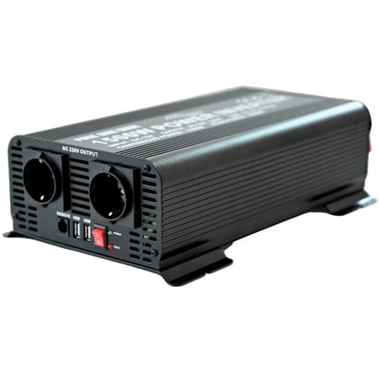 Maximum output power 2400W (for a short time) Protection class IP20 5V DC USB port output (2.1A max.) Active fan cooling Pura 1500W Inp. 12V DC Out 220V AC. Consigliato per condizionatori e pompe di calore automotive. Spegnimento per sovratensione: >= 15V DC. Allarme e spegnimento automatico per batteria scarica, sovratensione, cortocircuito e surriscaldamento. Porta d'ingr Pura 1500w Inp Onda . 12V DC Out 220V AC Inverter Inverter Onda Sinusoidale