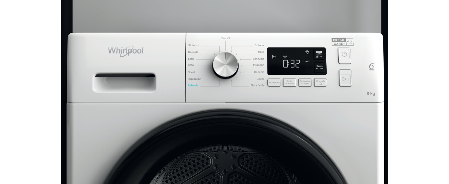 9 Kg Spie Rosse Asciugatrice A Libera Installazione - FFT M11 9X2B IT Asciugatrice 10 Kg ASCIUGATRICE WHIRLPOOL ASCIUGATRICE 9 KG, CLASSE A++, 120 L Caratteristiche di questa asciugatrice a libera installazione Whirlpool: eccezionale capacità del cestello di 9 kg per non restare mai senza spazio. Carico, 9 kg ; Tecnologia, Pompa di calore ; Tipologia incasso, Libera installazione ; Finitura, Bianco ; Larghezza, 60 cm 1 Aperta 2 Cassetto 3 Pannello di controllo 4 Cestello 5 Retro Mantenere l'asciugatrice al massimo delle sue performance non è mai stato così semplice Opzioni: Livello di asciugatura regolabile, FreshCare+, Blocco tasti, Rapido, Partenza ritardata FILTRO EASY CLEANING Facile da pulire in soli 3 passaggi. FRESHCARE+ Mantiene i capi freschi e morbidi fino a 6 ore dopo la fine del ciclo di asciugatura grazie al mantenimento della temperatura ideale all’interno del tamburo e a lenti movimenti dello stesso