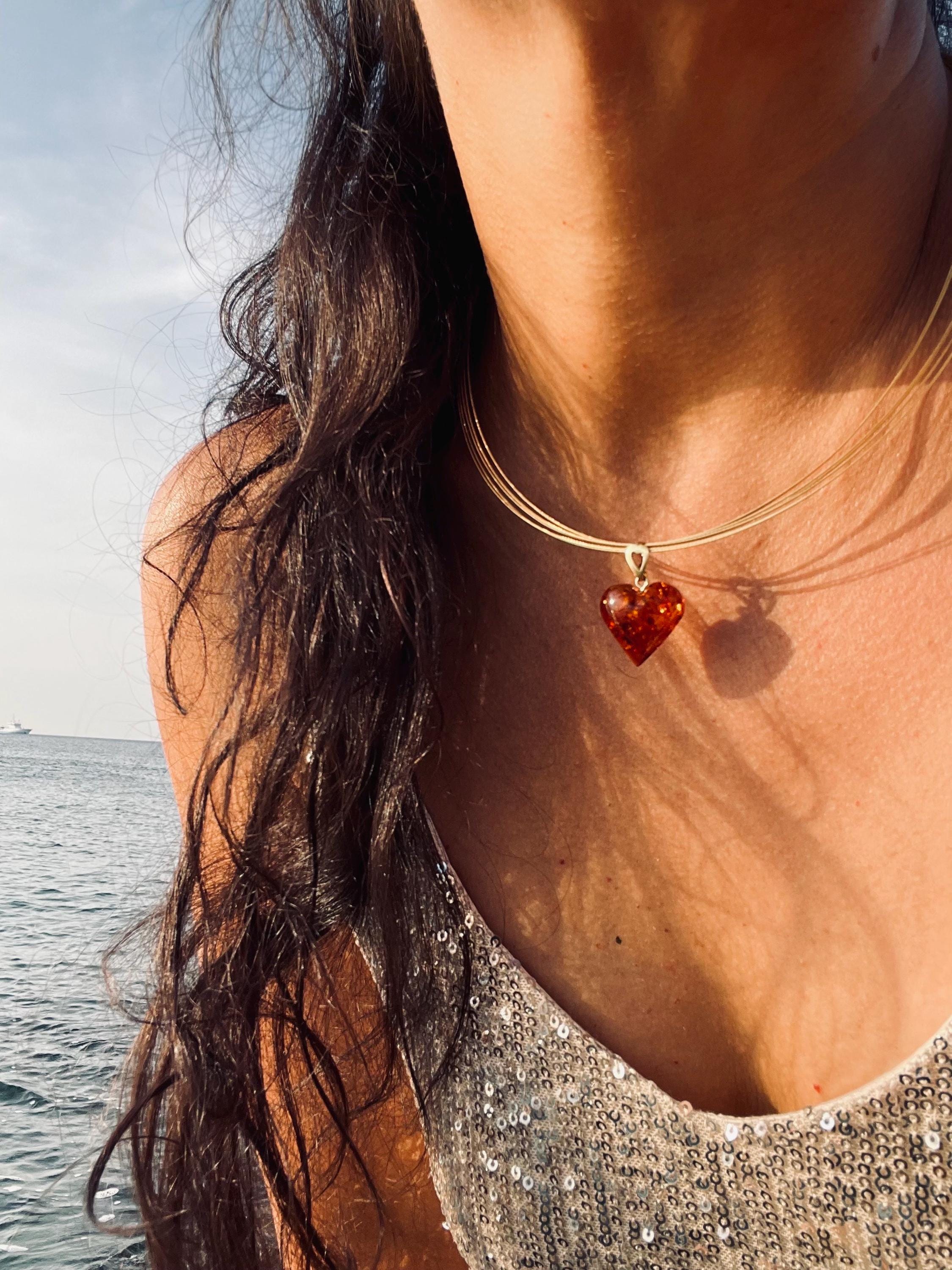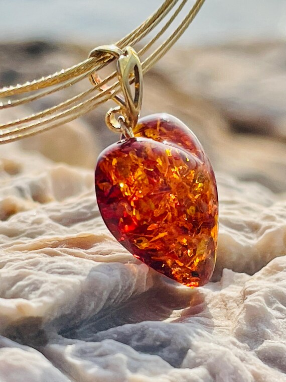 Ciondolo A Cuore In AMBRA BALTICA Cognac / Marrone Intagliato In Argento Sterling 925 (Polonia) - Pietra Preziosa Naturale E Genuina - Italia