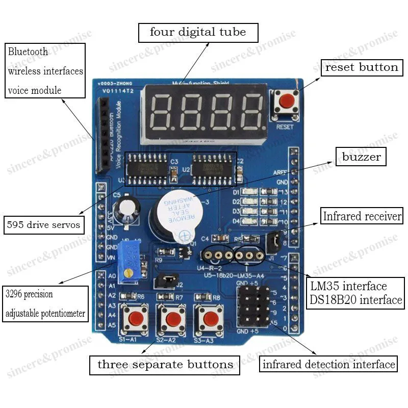 (Può allarme, pronuncia, ecc. Questo prodotto include anche un manuale utente elettronico, disponibile in inglese, tedesco, francese, spagnolo, italiano, polacco e olandese. ) * Bluetooth, interfaccia wireless, modulo vocale, modulo di riconoscimento vocale, è possibile eseguire esperimenti di comunicazione wireless. Hailege Interfaccia Multifunzionale Shield Protype Shield Scheda di Espansione UNO 2560 R3 con LM35 Ricevitore a Infrarossi Cicalino Bluetooth Funzione di Espansione Interfaccia Wireless ... modulo LED rosso, modulo LED blu, modulo ricevitore a infrarossi * 'interfaccia del sensore di temperatura, è possibile eseguire un esperimento di misurazione della temperatura. . Caratteristiche: * Il segnale acustico può essere utilizzato per esperimenti sonori. Arduino Xbee Shield Hailege Multifunctional Interface Shield Protype Shield Expansion Card Scheda Arduino Uno Offriamo la Dichiarazione di conformità. * Interfaccia del sensore di temperatura LM35, la misurazione della temperatura può essere eseguita sperimentalmente (senza LM35. * Ricevitore a infrarossi incorporato, può essere utilizzato per qualsiasi esperimento di controllo remoto a infrarossi (senza il ricevitore integrato). Manuale di istruzioni: 1. Scheda di espansione collegata direttamente al modulo di riconoscimento vocale non specifico LD3320, è possibile ottenere il controllo vocale. 2. Scheda di espansione collegata direttamente al modulo della porta Bluetooth seriale wireless, è possibile controllare il controllo della luce del telefono cellulare e il movimento dell'auto intelligente. 3. Con la scheda di espansione collegata direttamente al modulo della porta seriale wireless APC220, è possibile ottenere la trasmissione di dati a lunga distanza. 4. Agganciando direttamente la scheda di espansione ai sensori fotoelettrici a infrarossi, è possibile ottenere statistiche sul traffico, evitamento intelligente degli ostacoli per le auto e altre funzioni. 5. Scheda di espansione direttamente con l'aggancio SYN6288 del modulo vocale libero, è possibile ottenere la funzione di trasmissione vocale. 6. Scheda di espansione direttamente collegata a SG90, MG945 e altri ingranaggi dello sterzo per ottenere il robot e altre azioni complesse. * Interfaccia servo, facile da usare il servo. 4 luci LED (indicatore LED per sapere quanto sia importante lavorare nel progetto vero e proprio, con questo indicatore è possibile lavorare direttamente con gli indicatori di stato del programma per facilitare il debug. 2560 R3 Scudo multifunzione Scudo Protype