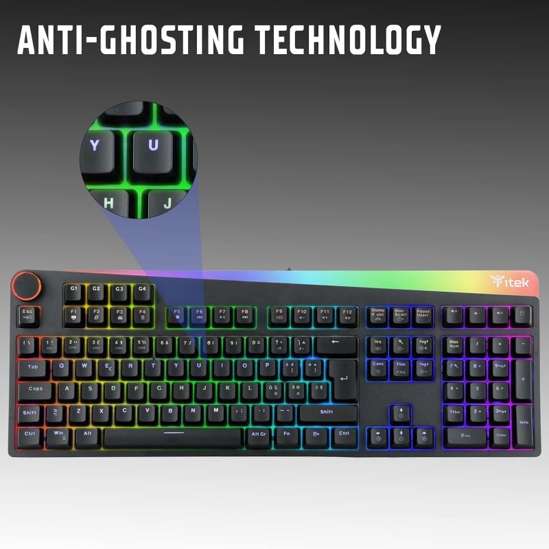 Itek X31 Tastiera X31 Itek Meccanica Switch Blu OUTEMU, RGB Tastiera Gaming Itek X31 è una tastiera per gamers e progamers dotata di switch meccanici OUTEMU blu molto performanti; particolarmente intrigante la parte superiore della tastiera fatta con materiale semitrasparente in grado di creare incredibili effetti luminosi RGB Tecnologia di connettività: USB Itek X31 è una tastiera per gamers e progamers dotata di switch meccanici OUTEMU blu molto performanti. Molto intrigante è la parte superiore dotata di materiale semitrasparente in grado di creare incredibili effetti luminosi RGB Dal sito del produttore è possibile scaricare un software molto intuitivo per poter programmare e personalizzare a proprio piacimento la periferica