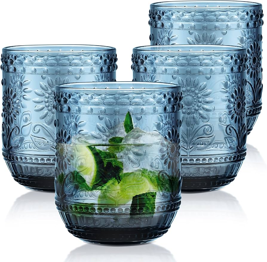 Joeyan Verde Bicchieri Acqua Vetro,Bicchieri Tumbler Vintage In Rilievo, Bicchieri Colorati In Vetro Per Succhi Latte Caffè Cocktail,350 Ml,Set Di 4, Lavabile In Lavastoviglie