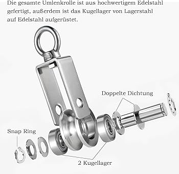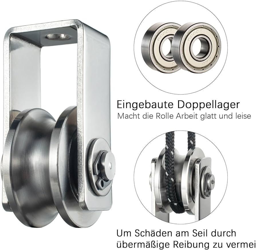 KCNOFNC Puleggia Con 2 Cuscinetti A Sfera, In Acciaio Inox 304, 32 2 cuscinetti a sfera: la puleggia ha due cuscinetti incorporati, che non solo aumentano l'efficienza del lavoro, ma riducono anche l'attrito, rendendo più facile la rotazione della puleggia e prolunga la durata della puleggia e della corda Facile manutenzione: le ruote sono fissate da dadi autobloccanti con funzione anti-allentamento per un facile smontaggio Puleggia Albero Motore KCNOFNC Puleggia in acciaio inox 304 per corda d'acciaio, puleggia per corde, puleggia con 2 cuscinetti a sfera, portata 500 kg, 1 pezzo Carrucola Per Puleggiare Caratteristiche: diametro puleggia 48 mm, larghezza scanalatura a V 16 mm, adatto per corde da 6 a 12 mm, carico sicuro 150 kg, portata massima 500 kg