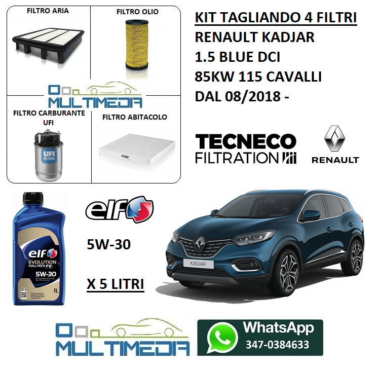KIT TAGLIANDO 4 FILTRI + 5LT OLIO ELF 5W30 Renault/ Kadjar 1.5 dCi 110 1461 - EUR 124,80. ... Quello che cerchi per la tua auto, a prezzi super scontati! 126517046268. KIT TAGLIANDO 4 FILTRI + 5LT OLIO ELF 5W30 Renault/ Kadjar 1.5 dCi 110 1461 - EUR 124,8 I prodotti kW&HP sono venduti esclusivamente da 2PRICAMBIAUTO, se acquisti il prodotto da un altro venditore e se ricevi un prodotto anonimo, non marchiato e senza imballo sigillato kW&HP sicuramente hai ricevuto un prodotto contraffatto e senza garanzie. Kit di manutenzione tagliando completo filtri e olio motore, Compatibile con KADJAR X-TRAIL QASHQAI II 1.6 DCI Elf 5w30 4 FILTRI E OLIO BARDAHL 5W30 NISSAN QASHQAI II 1.5 DCI 85KW 115 CV | EBay Kit Tagliando Filtro abitacolo, Filtro del carburante, Filtro dell'aria, Filtro olio, Olio motore (in latte da 1lt oppure da 5lt a seconda della disponibilità di magazzino) QUESTO KIT INCLUDE: FILTRO ARIA FILTRO OLIO FILTRO CARBURANTE FILTRO ABITACOLO (o filtri a seconda della disponibilità di magazzino) 5 LITRI DI OLIO MOTORE ELF 5W-30 FE/MSX (in latte da 1lt o da 5lt a seconda della disponibilità di magazzino)