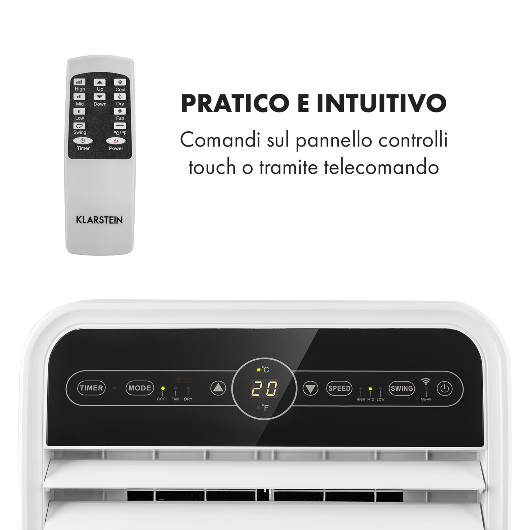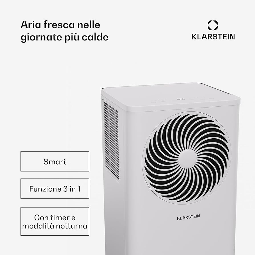 FRESCHEZZA 3 IN 1: Questo condizionatore portatile combatte il caldo con 3 potenti modalità: aria condizionata, deumidificatore e ventilatore. Le sue comode rotelle permettono inoltre un facile spostamento da una stanza all’altra senza intoppi FUNZIONI DI COMFORT AVANZATE: personalizza il raffreddamento con il timer e la modalità notturna di questo condizionatore. OPZIONI INTELLIGENTI: goditi la connettività IoT con questo condizionatore portatile. Con questo piccolo condizionatore d'aria avrai un clima confortevole in stanze fino a 25 m². MOBILITÀ E FACILE INSTALLAZIONE: grazie alle rotelle e al tubo di scarico semplice da installare, questo condizionatore può essere spostato e installato in qualsiasi stanza, dalla cucina alla camera da letto, per un comodo raffreddamento localizzato. Condizionatore Senza Unità Esterna Klarstein Condizionatore Portatile 3 In 1, 9.000 BTU, Climatizzatore Mobile Con Deumidificatore E Ventilatore, Controllo Vocale E App, Telecomando, Tubo Di Scarico, Per Stanze Fino A 31m², Bianco Condizionatore 12000 Btu Inverter EFFICIENTE E SOSTENIBILE: alimentato da un robusto compressore e dal refrigerante R290, questo condizionatore portatile offre un raffreddamento con una potenza di 7.000 BTU (2,45 kW) mantenendo un'elevata efficienza energetica (classe A).