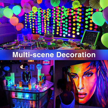 Descrizione prodotto L'illuminazione è una parte importante della creazione di atmosfera e rafforza l'effetto visivo del tuo evento. Faretto a luce nera Caratteristiche del prodotto: Potente luce nera Lunga durata Lunghezza del cavo di alimentazione: 1,5 metri Nota per l'uso per la luce nera: maggiore è la potenza, maggiore è la temperatura, il che non influisce sulla funzione. Versatili possibilità di applicazione Facile installazione Luce nera a led UV Ideale per feste a luce nera, Natale, Halloween, club, acquari, body art, spettacoli teatrali. I blacklight a LED si illuminano al buio, soprattutto su oggetti colorati al neon, vernici UV per il corpo e materiali fluorescenti visibili. Potente luce UV: le luci nere utilizzano SMD 2835 (LED che emette luce ultravioletta) come fonte di luce, per dare alla sostanza fluorescente luminosa una luce invisibile più intensa e rendere luminose le vostre feste in interni ed esterni Il CREATESTAR 5W UV blacklight con una lunghezza d'onda di 395nm può entrare in collisione con pigmenti reattivi, coloranti e colori per creare un effetto visivo fresco. 5W Luce nera UV Funzionalità proiettore Decorazioni: Mostre d'arte, acquario, musei, teatri, palestre, dipinti d'arte, mostre in galleria, pittura fluorescente, body art, body painting UV Custodia riflettente a 120° : La nostra luce nera da 5 W è dotata di un riflettore da 120° con una riflettività ultra elevata, che migliora l'efficienza dei LED, riflette la maggior parte delle lampadine invisibili e proietta con un ampio angolo per coprire più aree Lampada a luce nera UV da 5W LED GKT 2 Pezzi 100W LED Luce Nera, Luce Nera UV, IP66 Impermeabile, Lampada uv con Spina per Halloween, Natale, Body Painting, Decorazione di Feste,Festa Glow,Pittura,Acquario Riprova! Dettagli Design a gancio portatile La luce nera a LED portatile da 5W può essere utilizzata ovunque. Con interruttore e spina Eccellente reattività fluorescente Faro Led LED Luce Nera 5W 2 Pezzi, Faro UV LED Faretto UV LED, Lampada UV Per Neon Sfera È quindi perfetta per feste al buio, murales fosforescenti, feste al buio e decorazioni di Halloween. Interruttore di sicurezza La luce nera è fornita con un cavo di alimentazione lungo 1,5 metri con un interruttore di sicurezza per l'accensione e lo spegnimento della luce nera. È sufficiente collegare un alimentatore mobile, un computer, un portatile, un adattatore USB, ecc. Contenuto della confezione: 2 x luci UV LED da 5W 2 x 150 cm di cavo di alimentazione di tipo C con interruttore 4 x staffe 4 x viti 4 x adesivi metallici rotondi