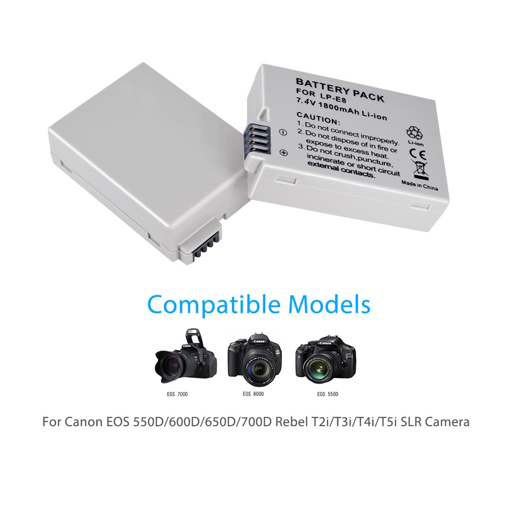 Naturalmente è possibile controllare la ricarica anche tramite il display LCD. Molteplici opzioni di ricarica: puoi caricarlo ovunque ci sia una presa USB; puoi collegarlo a un caricatore da parete USB, un adattatore mobile, un caricatore per auto, un alimentatore mobile o una batteria esterna. Completamente carica, quindi non devi preoccuparti di perdere grandi foto e video. Doppio caricatore veloce: ricarica rapida di due batterie contemporaneamente con qualsiasi fonte di alimentazione USB. Grazie all'ingresso sufficiente da 5 V/2,1 A, le batterie possono essere ricaricate rapidamente. Buy Schsteindar LP-E8 ( 1800 mAH ) for Canon LPE8 EOS 550D 600D 650D 700D Kiss X4 X5 X6i X7i Rebel T2i T3i T4i T5i Camera Battery only for Rs. 2499 from . Only Genuine Products. 30 Day Replacement Guarantee. Free Shipping. Cash On Delivery Grazie all'ingresso sufficiente da 5 V/2,1 A, questo caricabatterie per fotocamera può caricare due batterie contemporaneamente senza collisioni. Può essere caricato o scaricato a seconda delle esigenze senza perdita di capacità; Le funzioni sono le stesse della batteria OEM Basta collegarlo al desktop, notebook o adattatore per cellulare. Caratteristiche: la differenza più grande rispetto agli altri è che può anche essere ingresso e uscita: con cavo di ricarica USB, quando la batteria del telefono è scarica, è possibile anche ricaricarla. La confezione include: 2 batterie di ricambio LP-E8 Nome: Caricabatterie per fotocamera digitale Modello: LP-E8 Ingresso: 5 V/2 A Uscita: 8,4 V Dimensioni: 118 mm*65 mm*24 mm Battery Pack PowerTrust 1Pcs 1800mAh LP E8 LPE8 LP E8 Battery + Dual USB Charger For Charger Best Buy Pratico da portare in viaggio. Il caricabatterie LCD intelligente impedisce il sovraccarico della batteria quando la ricarica è completa. Facile da usare: design ultra compatto, comodo da trasportare e può essere ricaricato ovunque e in qualsiasi momento.