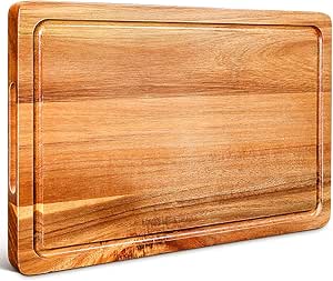 Il tagliere multifunzionale ad uso reversibile è sicuramente lo strumento più eccellente per la vostra cucina. 💕 TAGLIERE DA 3,8 cm DI SPESSORE - Il nostro tagliere in legno da 3,8 cm di spessore offre un supporto stabile durante il taglio degli alimenti, anche su piani di lavoro scivolosi, evitando di scivolare durante il processo di taglio. Doppie maniglie integrate per sollevare facilmente il tagliere e trasferirlo dalla cucina al tavolo da pranzo. La superficie del tagliere in legno è lucida e priva di bave per un tocco morbido e antiaderente. E ricoprire regolarmente la superficie del tagliere con olio d'oliva. 💕 UN REGALO FAVOLOSO- Regalo memorabile per l'inaugurazione della casa o per il matrimonio, questo tagliere in legno sarà un'aggiunta gradita per la famiglia e gli amici a Natale, per la festa della mamma e persino per i compleanni. Il tagliere mantiene il colore marrone scuro del legno e le venature diritte o ondulate durante la lavorazione. Il lato posteriore è dotato di una profonda scanalatura per poter riporre il cibo tritato nella scanalatura prima di continuare a tagliare altri alimenti. Inoltre, è più delicato per i coltelli, evitando che le lame si opacizzino. Tagliere In Legno Professionale Acacia Per La Cucina, Tagliere In Legno Di Macelleria Spesso 3,8 Cm Tagliere Acciaio Inox