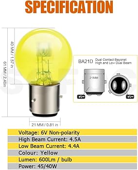 【Compatibilità universale】 Progettati per adattarsi a un'ampia gamma di motociclette, scooter, ATV e ciclomotori, rendendoli una scelta versatile per vari modelli di veicoli. Contenuto della confezione: 1 lampadina alogena BA20D Nota: Questa lampadina è per auto a corrente continua o moto. Se avete bisogno di corrente alternata, questo tipo non si adatta. new tecnologia chip LED ad alta luminosità. BA20D H6 Moto LED Faro Hi/Lo Lampadina Di Potere Caldo/freddo Bianco 6V/12V/24V Vespa Px Lampadina Moto Alogena Clear S2-BA20D - BRYTE 50 Special Queste lampadine offrono una visibilità e una sicurezza superiore per la guida notturna, garantendo una vista chiara della strada davanti. 【Garanzia】 Garanzia di 12 mesi, sostituzione gratuita con un nuovo dopo la conferma delle nostre foto del prodotto da parte del cliente. 【Specifiche】 Bulbo alogeno per motocicletta BA20D. Colore: 6000K. Tensione: 6V. Potenza: 45/40W. Lumen: 600lm. Alta luminosità. 【Efficiente energetico】 Nonostante il loro alto output, queste lampadine sono efficienti energeticamente, riducendo il consumo della batteria e garantendo una maggiore durata della vita del sistema elettrico della tua motocicletta. Fornisce un'emissione luminosa stabile, adatta per condizioni di guida notturne o in condizioni di scarsa illuminazione.