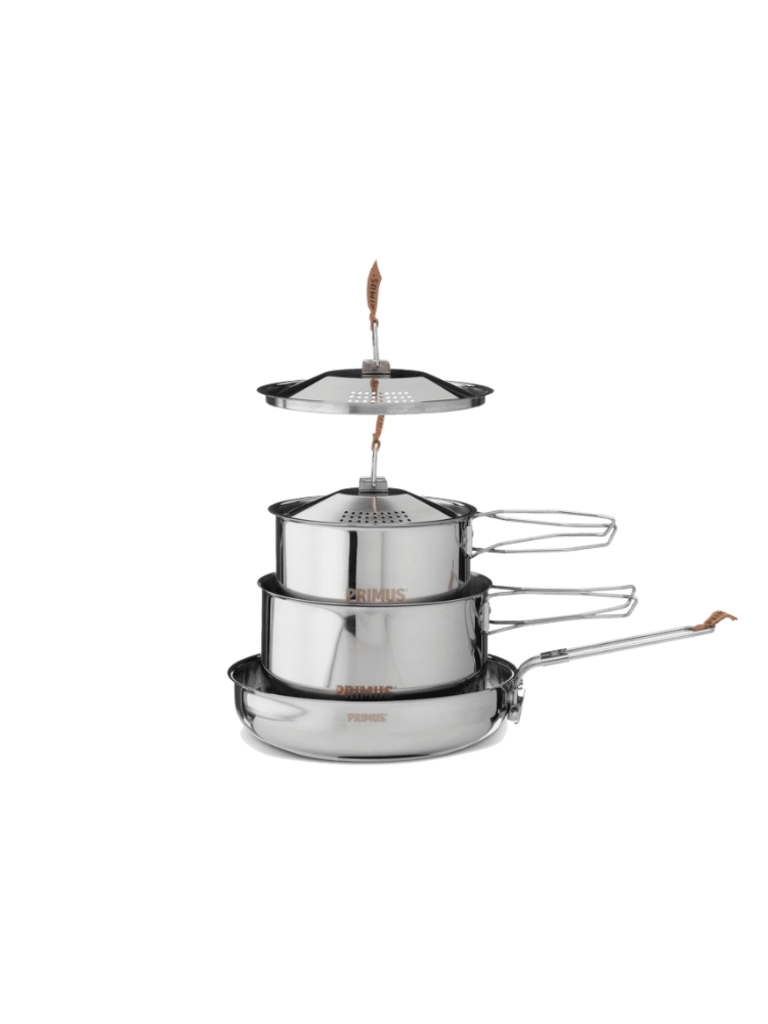 The Primus Campfire Cookset Large fully outfits your camping kitchen. A 3.0L stock pot, a 1.8L saucepan, and a frying pan are made of lightweight, durable, and easy-to-clean stainless steel. The entire set packs conveniently in an included sack La padella è dotata di un manico pieghevole e su una base in alluminio per una distribuzione uniforme del calore Il set è composto da due vasi (1, 0 e 1, 8 L), due coperchi con scolapasta integrato e una padella. Koch Set realizzato in robusto acciaio INOX 18/8. Progettato per anni di duro utilizzo. Il set è composto da due vasi (1, 0 e 1, 8 L), due coperchi con scolapasta integrato e una padella Campfire Cook Set Primus Campfire Set Large - Zestaw Garneków I Patelni Set Pentole Le pentole impilabili e la padella è possibile risparmiare spazio in borsa in dotazione.