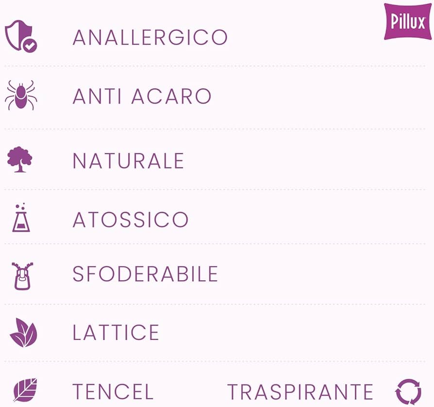 FEDERA SPECIALE - Il cuscino è dotato di uno speciale rivestimento sfoderabile TENCEL a base di pura fibra di origine botanica estratta direttamente dal legno naturale. Maggiore eco-compatibilità rispetto a cotone, poliestere e polipropene. I migliori prezzi per Guanciali In Lattice Naturale tra i negozi italiani online, aggiornati ogni giorno! Facile da usare | Gratis | Recensioni affidabili | Trova la tua offerta adesso Dotato di fori d'areazione su entrambi i lati, ti garantisce una traspirazione ed un'igiene costante per tutta la notte. UNICO - Il lattice è il materiale biologico più confortevole al mondo, è dotato di una elasticità naturale incredibile. 12 cm di spessore al centro e via via diminuendo verso i lati, rappresenta l'altezza ideale per la maggiorparte delle persone. ALTEZZA STANDARD - L'altezza di questo cuscino è definita come standard in base alle misurazioni medie della popolazione Italiana. QUANDO USARLO? Cuscino in Lattice con un'altezza di 12 cm. NATURALE - Cuscino in lattice di origine naturale, anatomico e molto confortevole. Naturale ed elastico, ha una struttura a cellule aperte, garantisce un sostegno confortevole e traspirante, antiacaro ed anallergico è ideale per chi soffre di allergie. Cuscini Letto Matrimoniale Cuscino In Lattice Naturale - Anatomico Di Persiani Casa - Macrolibrarsi.it Cuscino Letto