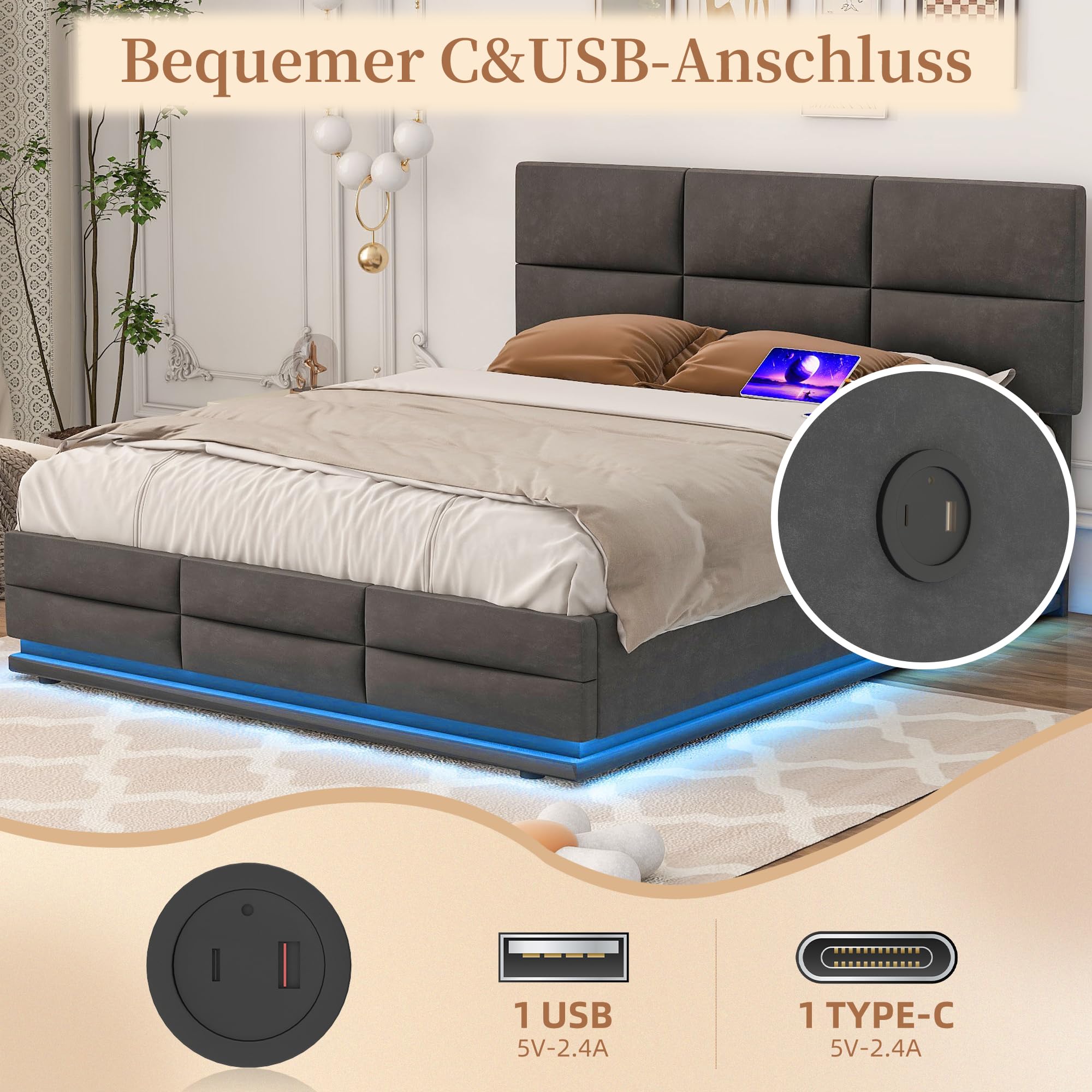 Letto Contenitore Letto Imbottito 140 X 200 Cm Con LED E Rete A Doghe, Lino E MDF, Grigio