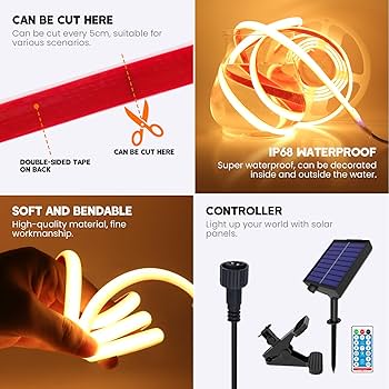 Con luce esterna remota: Le nostre luci a striscia LED sono costituite da perle di lampada da 120leds/m che significa produrre più luce per il tuo percorso. è possibile controllare con il telecomando. Neon ultra-luminoso: questa lampada al neon da 12V 2835 con 120 LED per metro offre un'esperienza di illuminazione eccezionalmente luminosa e dinamica È inoltre possibile modificare la luminosità tramite il controller, con un totale di 8 modalità, per cambiare il controllo in qualsiasi momento. Flessibile e dimmerabile: grazie al suo design flessibile, è possibile piegare e modellare facilmente le strisce LED per adattarle a qualsiasi superficie o angolo. Perfetta per l'arredamento della casa, le decorazioni per feste, le decorazioni per matrimoni, le decorazioni per le vacanze, il patio, il giardino, il cortile, la recinzione,il tetto e così via. Facile da installare:Il design staccabile consente di portare il pannello solare all'esterno separatamente per la ricarica, risparmiando il fastidio di appenderlo ogni volta con la luce principale! Neon ultra-luminoso: questa lampada al neon da 12V 2835 con 120 LED per metro offre un'esperienza di illuminazione eccezionalmente luminosa e dinamica. Più durevole di altre luci solari all'aperto, bello per le decorazioni esterne del giardino del passo. Impermeabile IP67:Il pannello solare e le strisce led Cob sono realizzati in materiale di alta qualità, resistente e impermeabile IP68, non c'è bisogno di preoccuparsi di esporre le luci all'umidità, alla pioggia o all'acqua! Luci Esterne Ad Energia Solare Solar Neon Light 12V 2835 120Leds/m IP67 Waterproof Neon LED Strip Solar Lamp Dimmable Remote Control Outdoor Garden Decoration Striscia Led Esterno Impermeabile