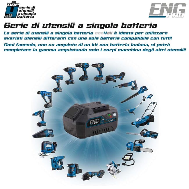 Fino a 30 colpi al minuto la graffettatrice e sparachiodi 2 in 1 è lo strumento adatto per per una lavorazione rapida ed efficiente in diversi campi. Batterie 2.0Ah ONE4ALL Compatibilità con Batterie engPRO - Utilizza batterie ONE4ALL 2.0Ah – 1B20-BL20 e ONE4ALL 4.0Ah – 1B20-BL40 per un'ampia scelta di alimentazione. Faro A Led Ricaricabile ENG PRO Faro Lampada 100 LED Luce Da Lavoro Faretto | Linea Professionale A Batteria ONE4ALL |50 W Luminosità Regolabile Fino A 5000 Lm | Solo Corpo Luci Solari Esterno Faro Lampada 100 LED Luce da lavoro Faretto | Linea Professionale a Batteria ONE4ALL | 50 W Luminosità Regolabile fino a 5000 lm | 2 Batterie 2 e 4.0 Ah Pistola per colla a caldo a batteria ONE4ALL Le batterie al litio ENG PRO sono il cuore pulsante della linea di elettroutensili ONE4ALL. Flessibilità e Adattabilità - Testa ruotabile a 360° per una massima flessibilità di illuminazione | Regolazione dell'inclinazione per adattarsi a diverse angolazioni e aree di lavoro. Questo elettroutensili è particolarmente utile per tagliare curve o linee intricate grazie al suo movimento alternato della lama. Un'unica batteria per più prodotti. Regolazione della Luminosità - Potenza luminosa: Modalità I 2000 lm, Modalità II 5000 lm | Regolazione graduale della luminosità tramite oscuratore girevole per adattarsi alle esigenze dell'ambiente. Per illuminare ogni spazio buio Lampada a LED La lampada da lavoro della linea ONE4ALL è progettata per fornire una fonte luminosa potente e efficiente per qualsiasi ambienti di lavoro. Graffettatrice e Sparachiodi 2in1 batteria ONE4ALL Elettrosega a batteria ONE4ALL Compatibile con stick di colla da 10-12 mm per una vasta gamma di applicazioni.