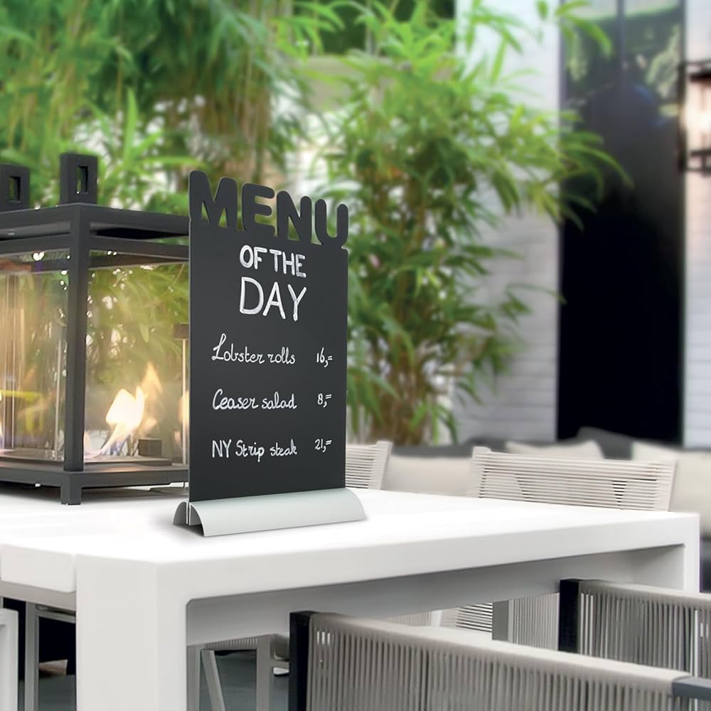 SUPERFICIE PERSONALIZZABILE E LUNGA DURATA: Facile da pulire e adatta all'uso con i pennarelli a gesso liquido di Securit. Resistente ai raggi UV e antigraffio, è ideale per un uso prolungato all'esterno con i pennarelli a gesso liquido resistenti all'acqua di Securit. SUPERFICIE PERSONALIZZABILE E LUNGA DURATA: Facile da pulire e adatta all'uso con i pennarelli a gesso liquido di Securit. Resistente ai raggi UV e antigraffio, è ideale per un uso prolungato all'esterno con i pennarelli a gesso liquido resistenti all'acqua di Securit. VERSATILITÀ INEGUAGLIABILE Avviso di sicurezza non adatto ai bambini di età inferiore ai 6 anni Con una gamma che spazia dalle soluzioni tradizionali a quelle più creative e innovative, le nostre lavagne da tavolo, etichette e segna tavoli sono pensate per rendere ogni area commerciale uno spazio elegante e funzionale. Perfetta per esporre menu del giorno, liste di cocktail o descrizioni dei piatti, adatta sia per interni che esterni. VERSATILITÀ INEGUAGLIABILE: Dimensioni di 25x15,2x2cm e peso di soli 0,2kg. La nostra linea in espansione comprende attualmente 728 articoli tra le gamme Home e Pro, e continua a crescere per soddisfare le diverse esigenze di mercato. Questi prodotti non sono soltanto pratici, ma aggiungono anche un tocco di design che valorizza l'atmosfera di qualsiasi locale. Siamo orgogliosi di presentare una vasta selezione di lavagne da tavolo disponibili in diverse forme e dimensioni, perfette per esporre menu, offerte o nuovi prodotti in modo visibile. Lavagnetta Magnetica Frigorifero SECURIT - Mini Lavagna Da Tavolo Sandwich - Per Pennarelli A Gesso Liquido - Per Caffè, Ristoranti, Bar, Negozi - Inserto Rimovibile - Doppia Faccia - Formato A5 - Base In Legno Segnaposto Personalizzato