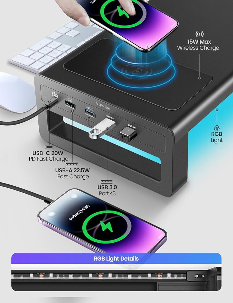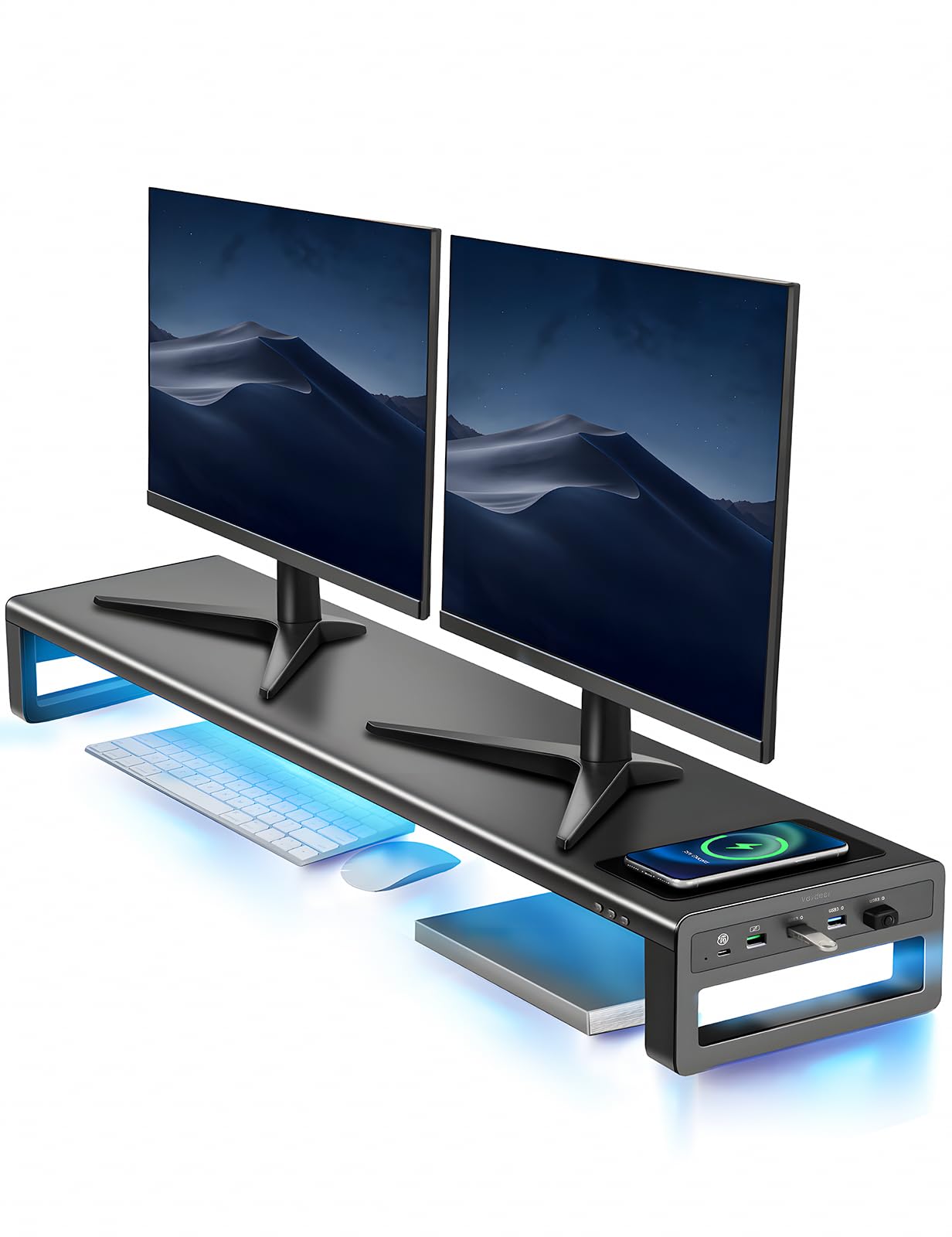 Supporto Per Monitor A 2 Livelli Con Tappetino Di Ricarica Automatica, 4 Porte Hub USB 3.0, Doppio Supporto Per Monitor, Supporto Da Scrivania In