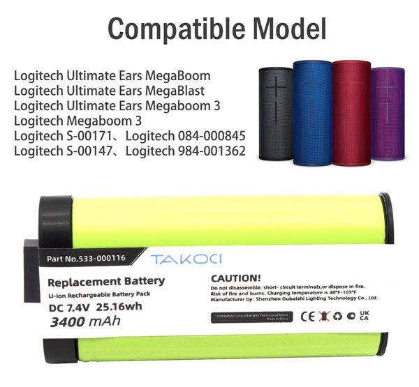 Ultimate Ears Battery For Replacement Battery For Logitech UE MegaBoom Compatible With S-00147 984-001362 084-000845 S-00171 Megaboom 3 Si prega di assicurarsi che sia il modello che il numero di parte della batteria siano abbinati al dispositivo prima dell'acquisto (è possibile trovare le informazioni relative nella descrizione del prodotto). Garanzia di rimborso di 14 giorni e garanzia di 12 mesi. Acquista 2600mah/3400mah Battery For Logitech 084-000845 984-001362 Megaboom 3 S-00171 Ultimate Ears Megaboom 3. Uno dei tanti articoli disponibili nel nostro Altoparlanti dipartimento qui presso Tipo di prodotto: Li-ion Volt: 7.4 Capacità: 2600mAh / 19.24Wh